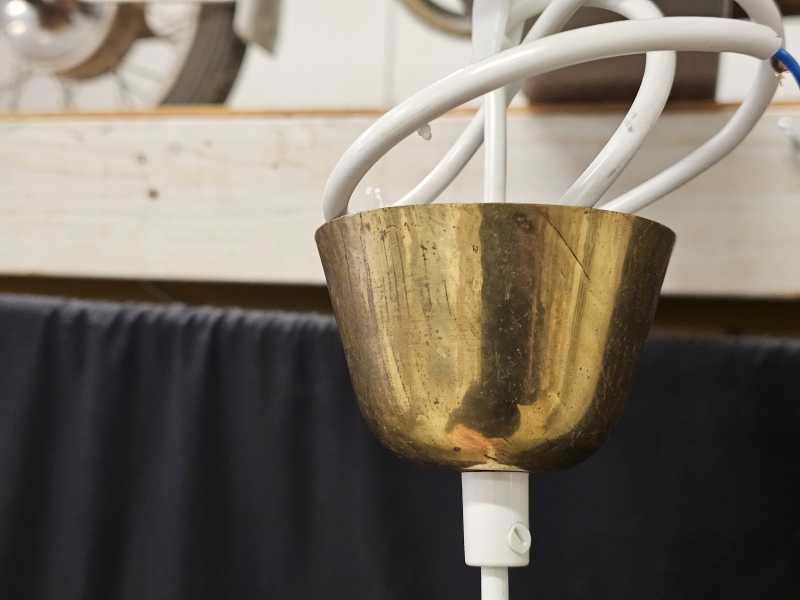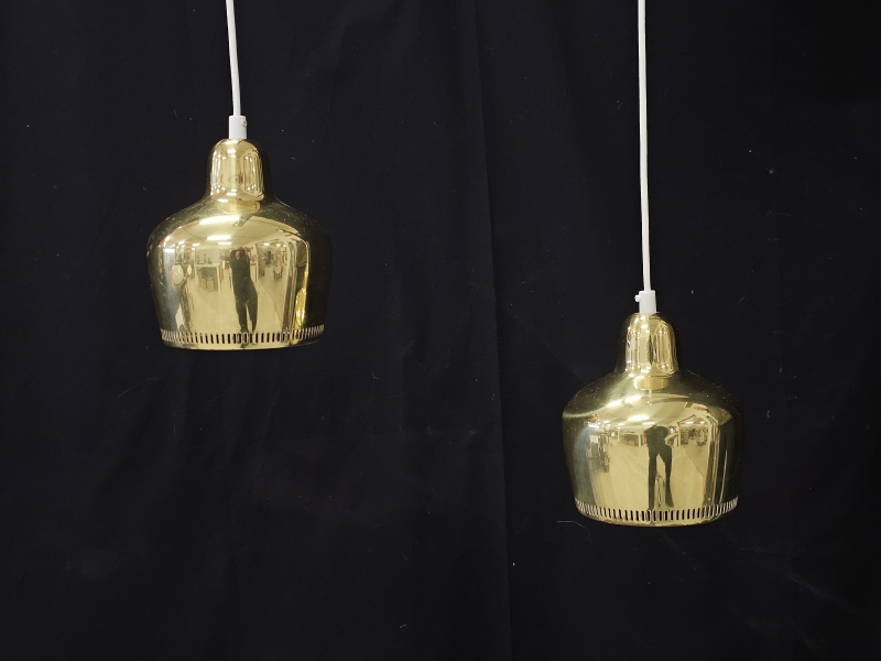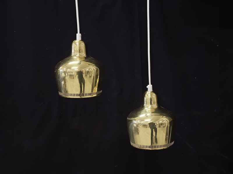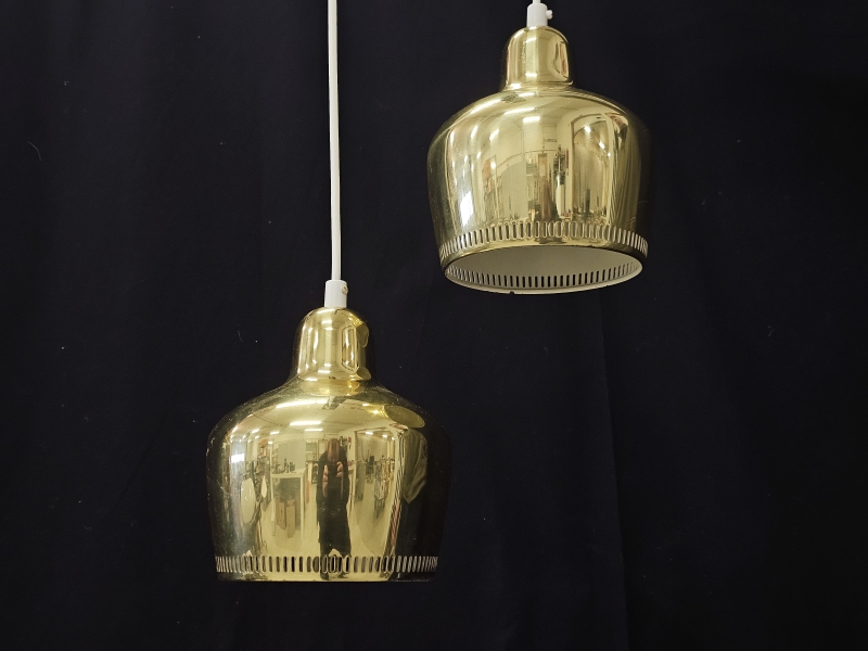 #860 2kpl Alvar Aalto A330S "Kultakello" kattovalaisimia, valmistaja Louis Poulsen 1950-60 -luvulla