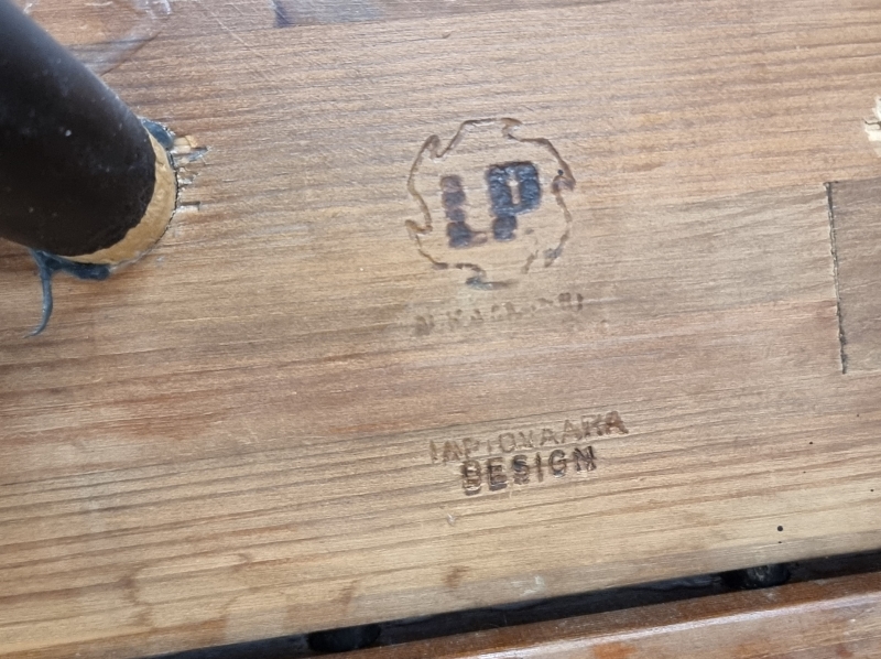 Kulumaa. Tuoleissa leimat, Laukaan puu. 69cm x 120cm, kork. 68cm