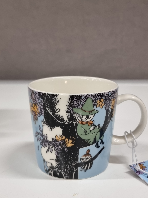 #734 4kpl Muumimukeja, yhdessä paketti mukana,"Muuminpäivä 2025" ja "Sydänystävät"