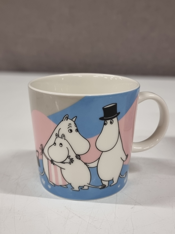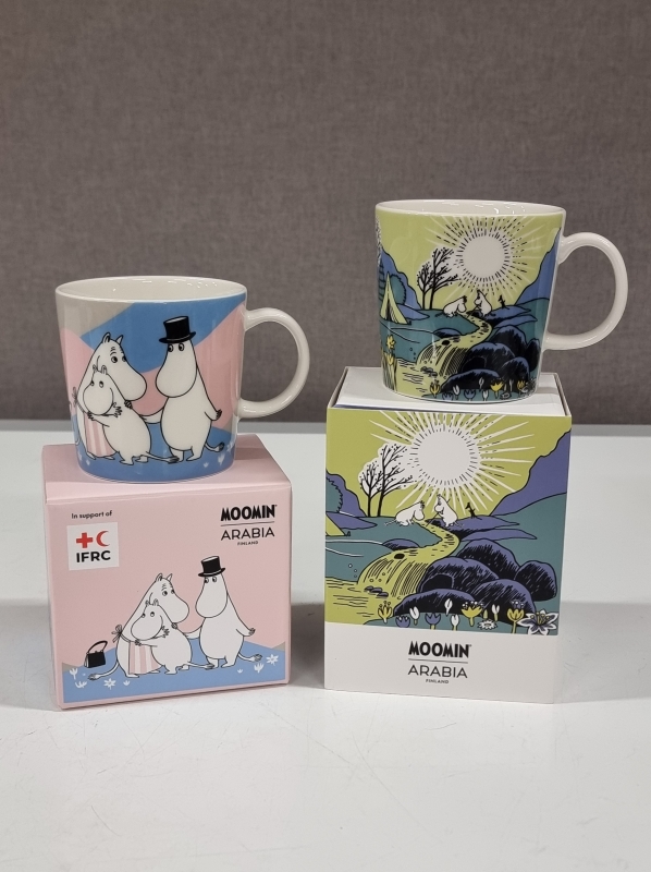 #742 2kpl Muumimukeja: "Muumipäivä 2024" ja "Kotona viimein" Punaisen Ristin erikoismuki