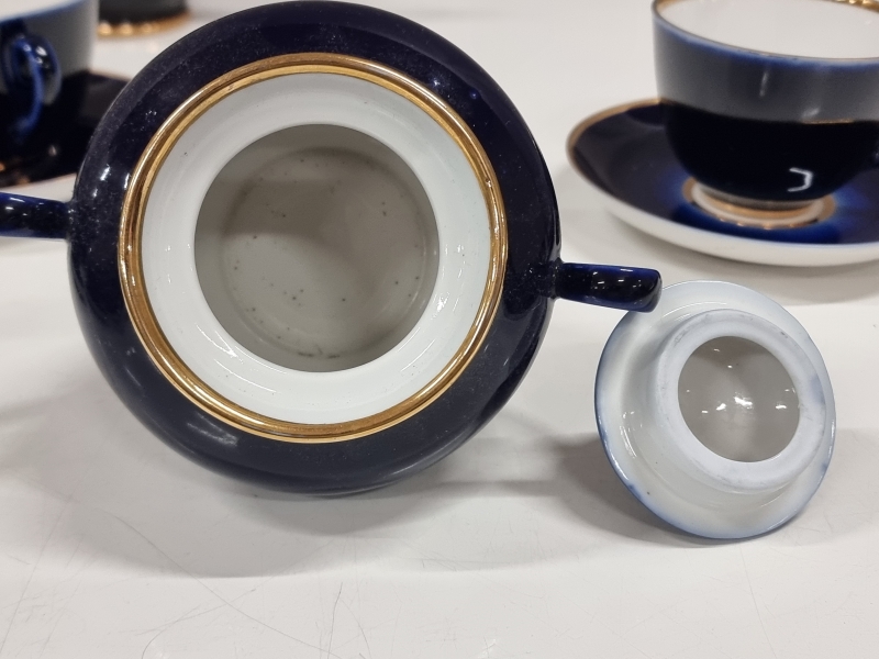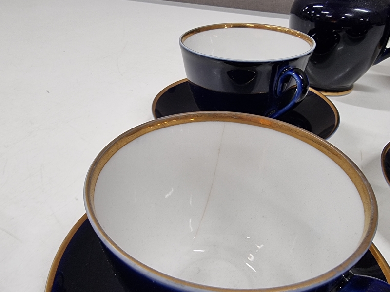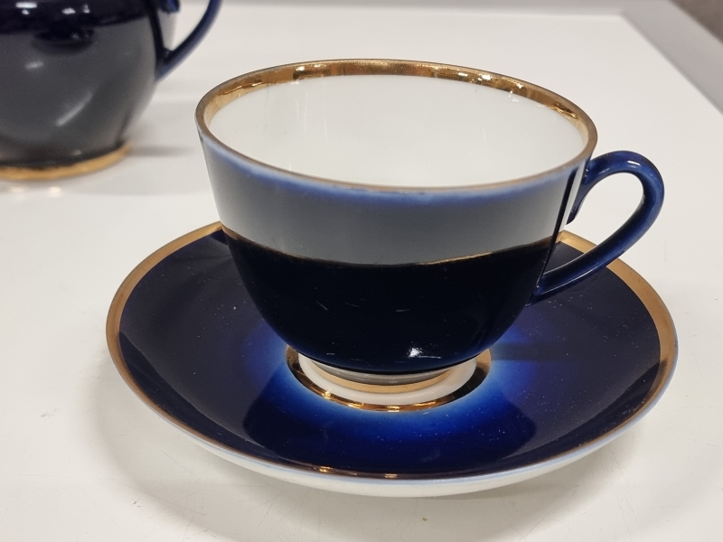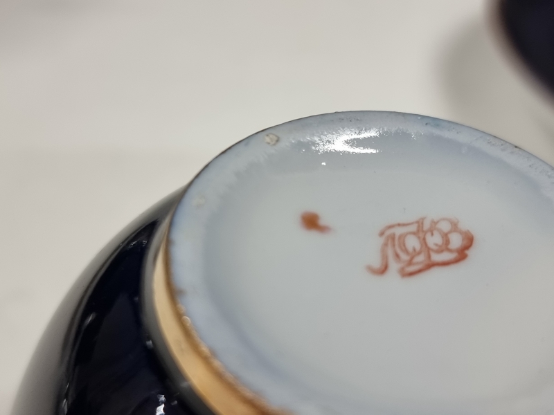Yhdessä kupissa halkeama. Sirottimesta puuttuu tulppa. Kupin halkaisija 9,5cm