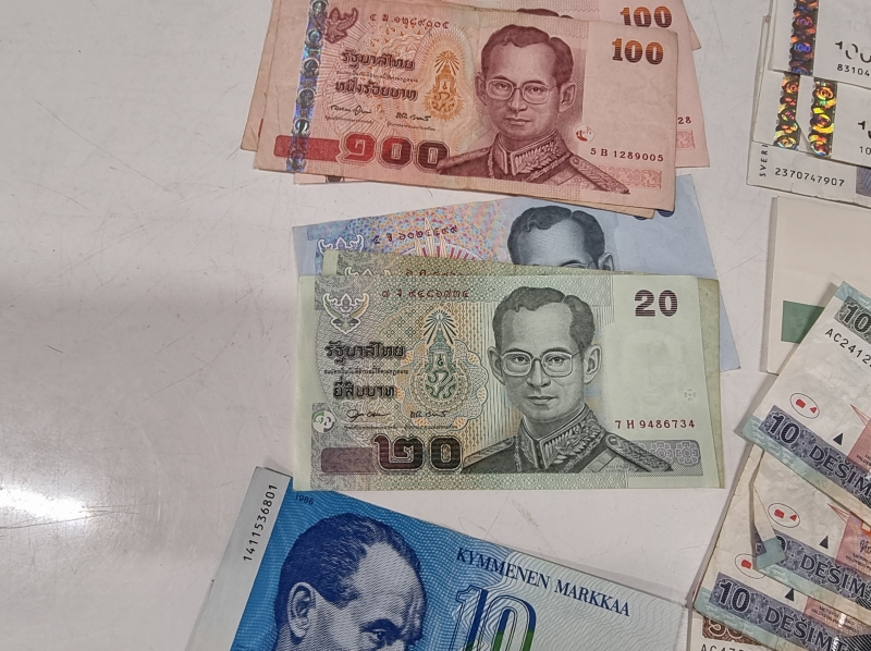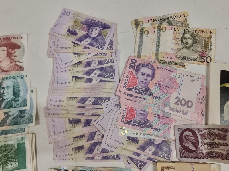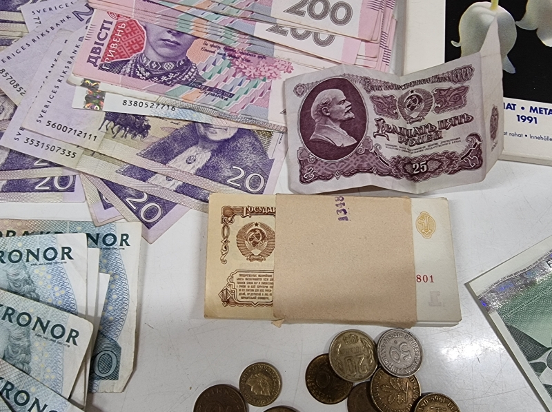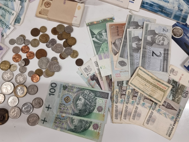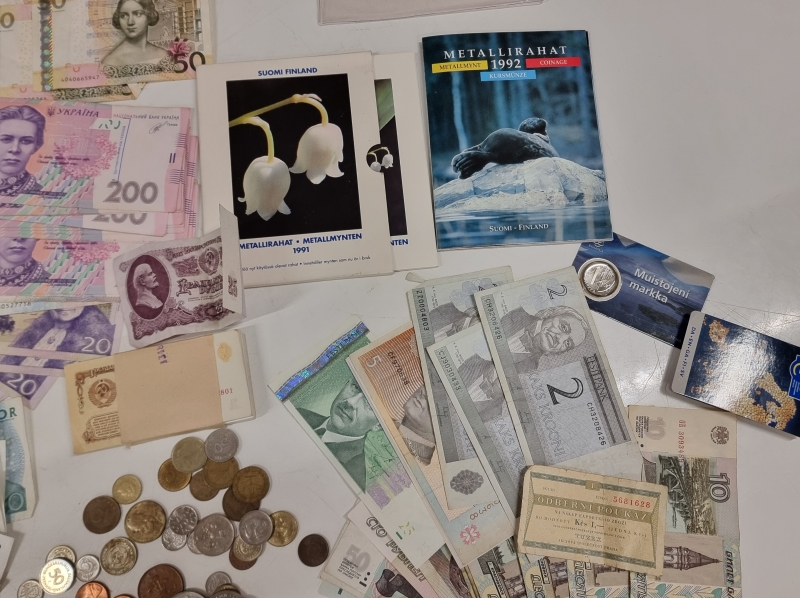 #2005 - Iso erä seteleitä ja kolikoita. Mm. Ruotsi 500 kruunua, Paavo Nurmi 10mk 1986 vuoden seteleitä