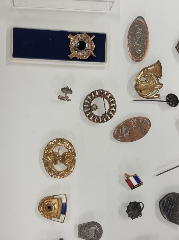 #1650 Erä merkkejä ja mitaleita, mm. Suomalaisen Kansantanssin Ystävät ry ja 1952 Olympia, osa hopeaa
