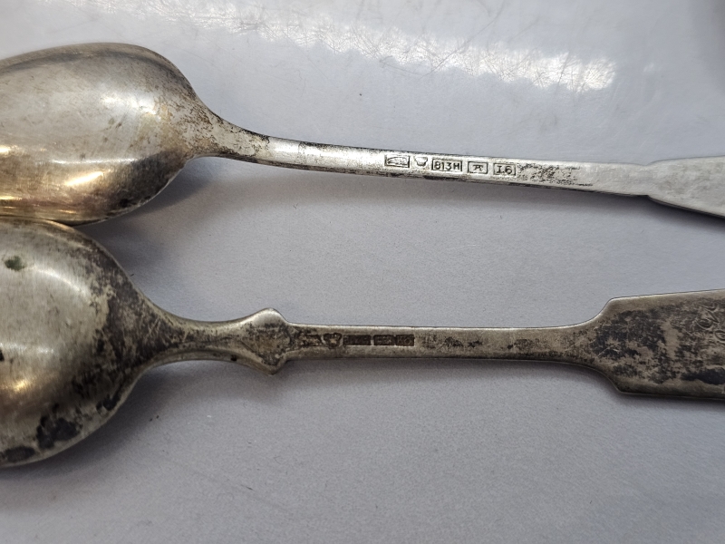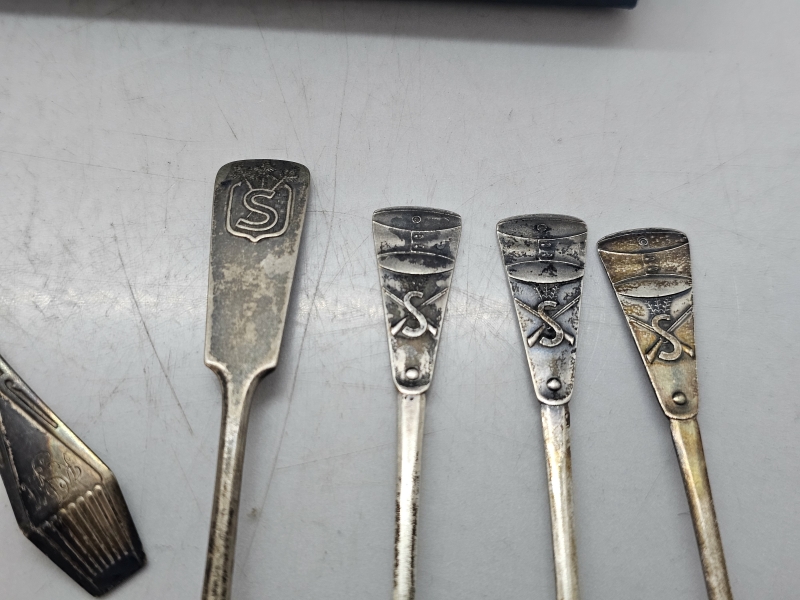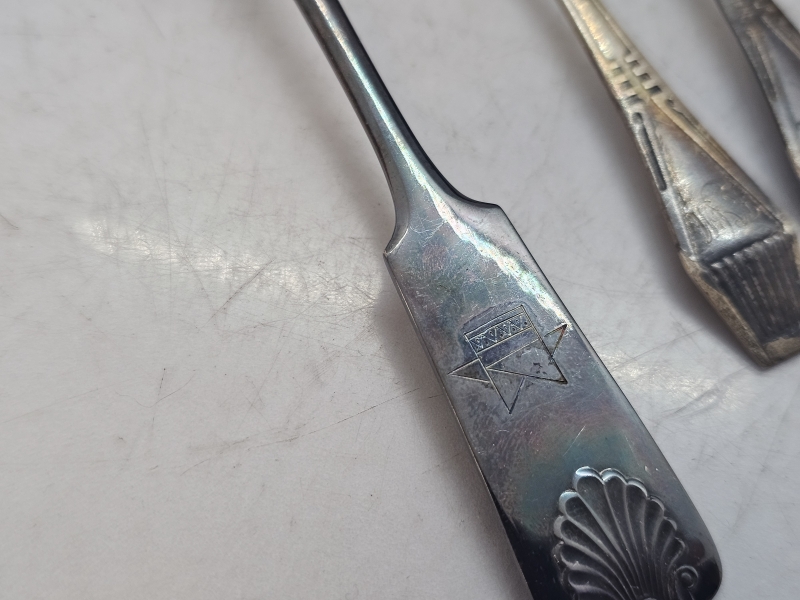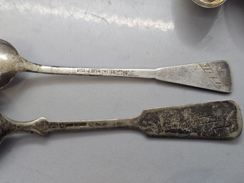 #1096 Erä hopeisia kahvilusikoita mm. suojeluskunta [102g] & musla-kakkuotin, 813-830h