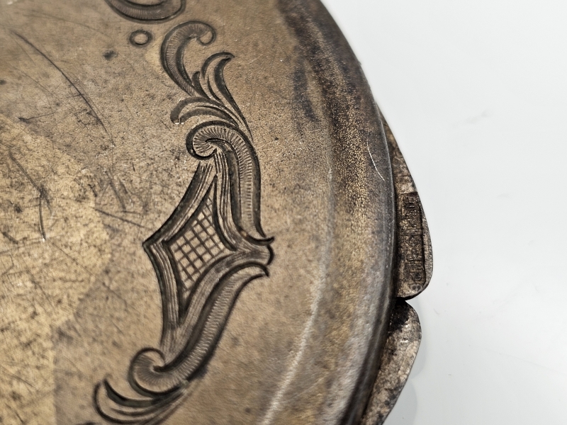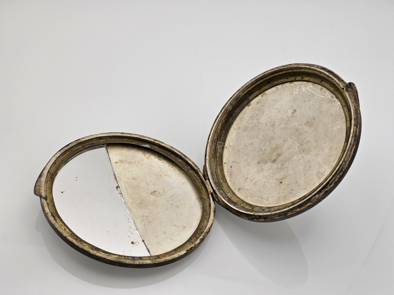 Bruttopaino 67g. Sisällä oleva peili rikki. Kaiverrus