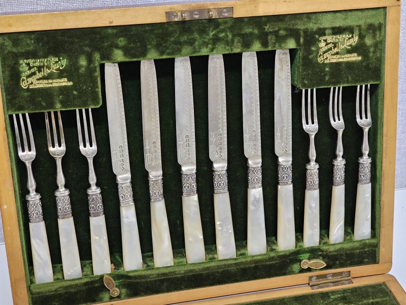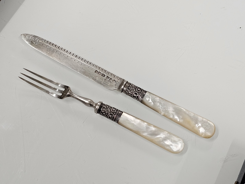 #1130 Todella hieno hopeinen aterinsarja helmiäiskahvoilla, R F Mosley & Co, Sheffield v.1904, 750g