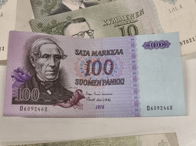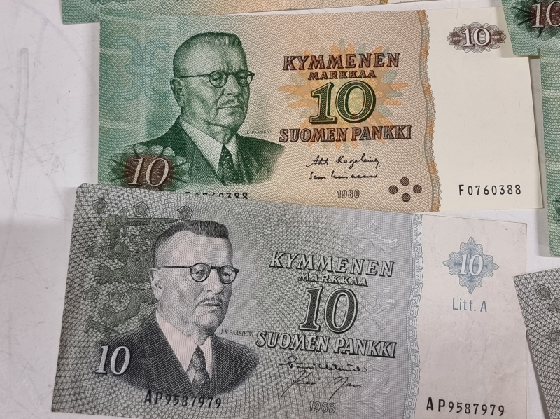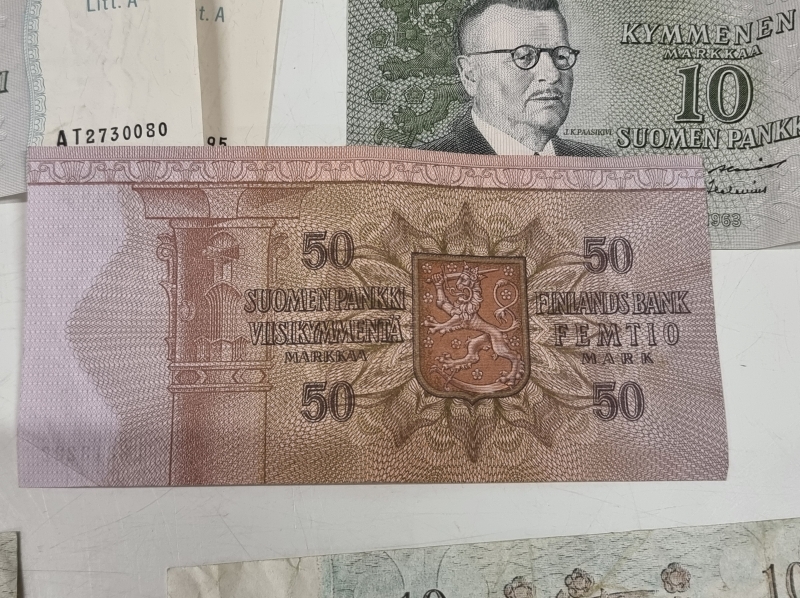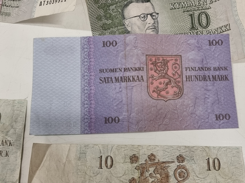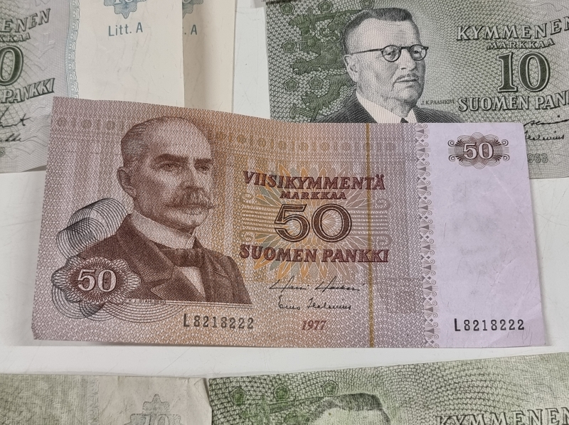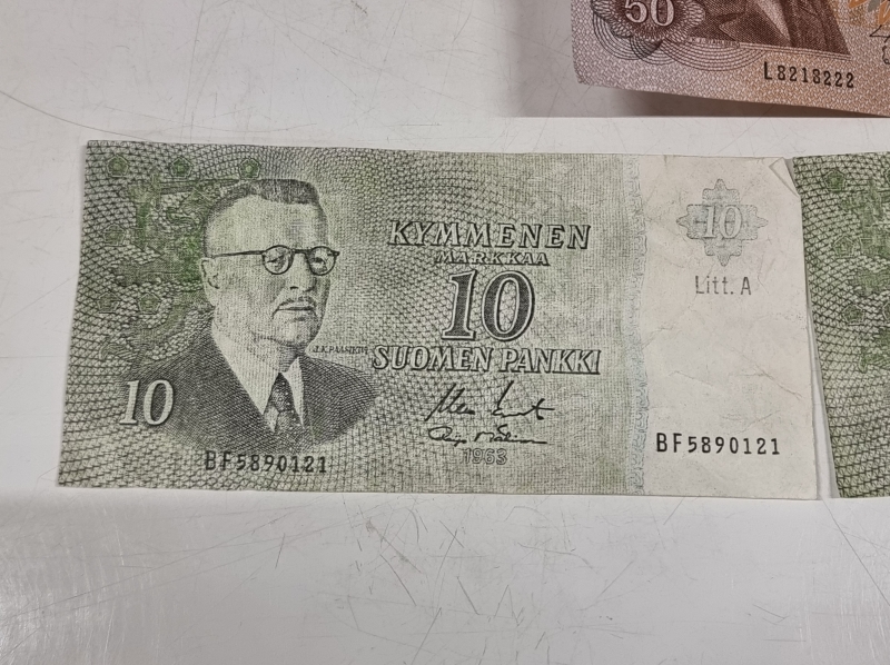 #2017 Suomalaisia seteleitä: 50mk 1977, 100mk 1976 + 3kpl 10mk 1963 väärennöksiä
