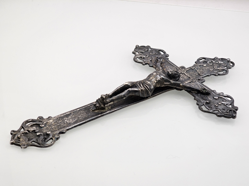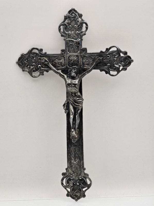 #1173 - Hopeinen krusifiksi seinäripustimella, 830h, 113g