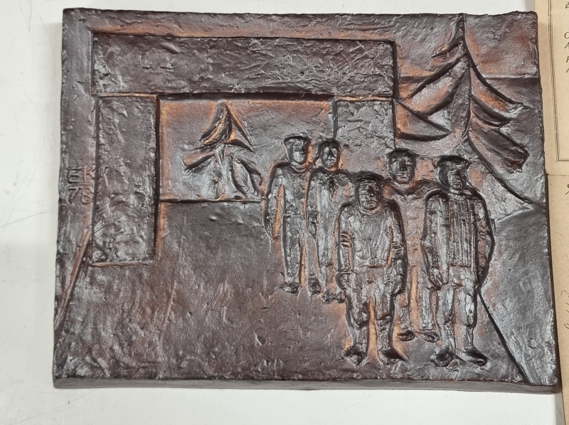 #1663 Punakaartin esineitä: "Tulivuori"-, kahle-, työväen järjestyskaartin merkki, reliefi ym.