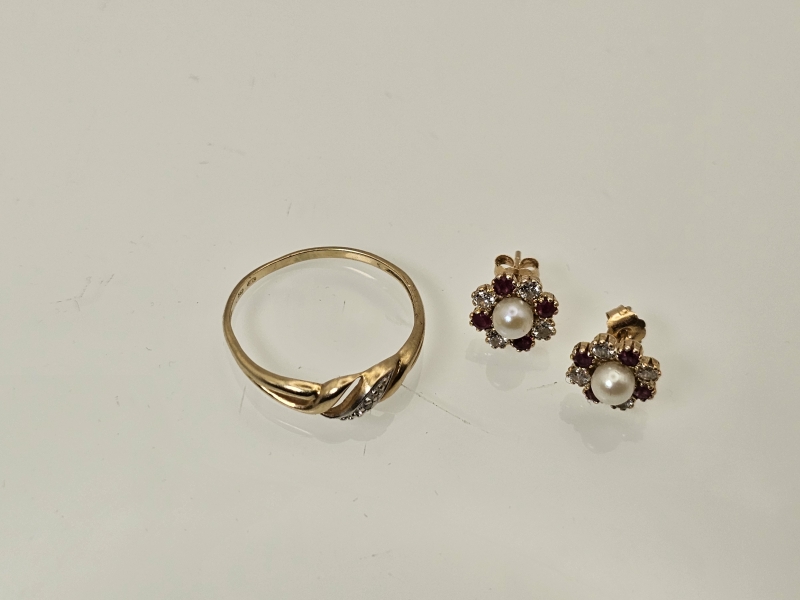 #1265 - 14k kultainen sormus timantilla + 14k korvakorut, yhteensä 2,37g