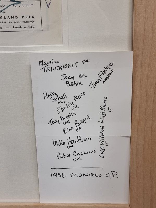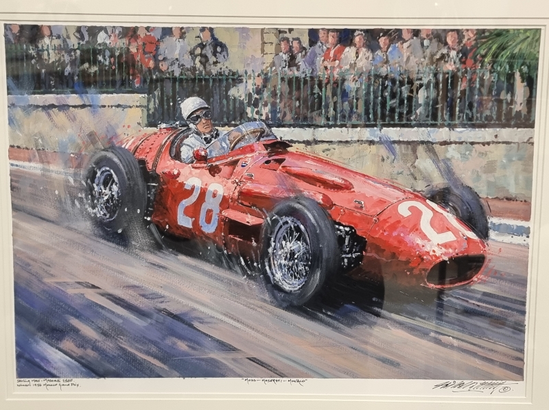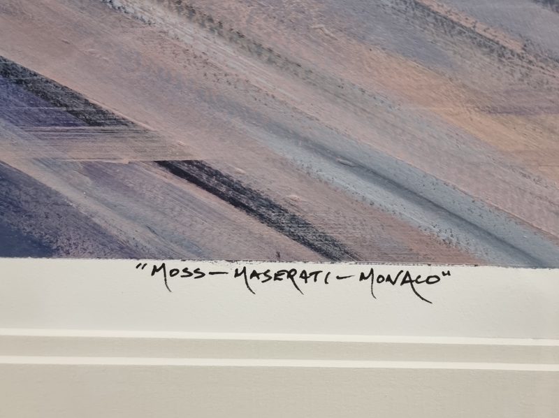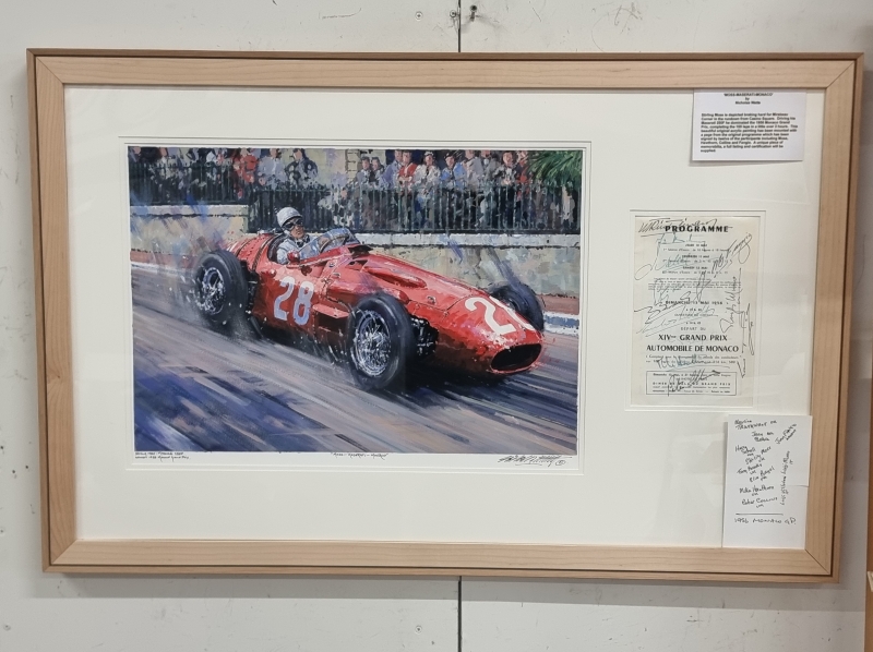 #804 Nicholas Watts signeerattu akryylimaalaus + 1956 Monacon GP käsiohjelma kuljettajien nimikirjoituksilla: Juan Fangio, Stirling Moss ym.