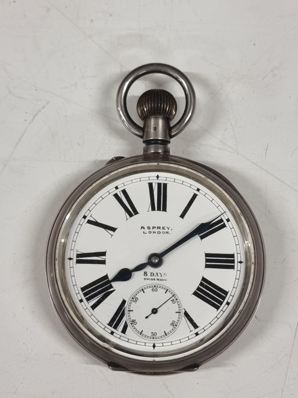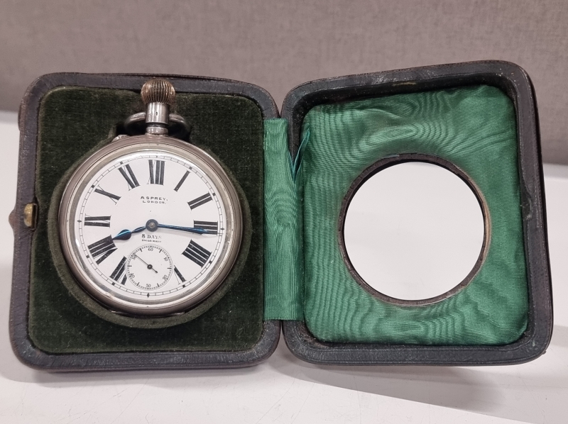 #1242 Harvinainen hopeinen Asprey 8 days taskukello alkuperäisellä kotelolla. 935h brutto 293g. Kotelon paino 183g