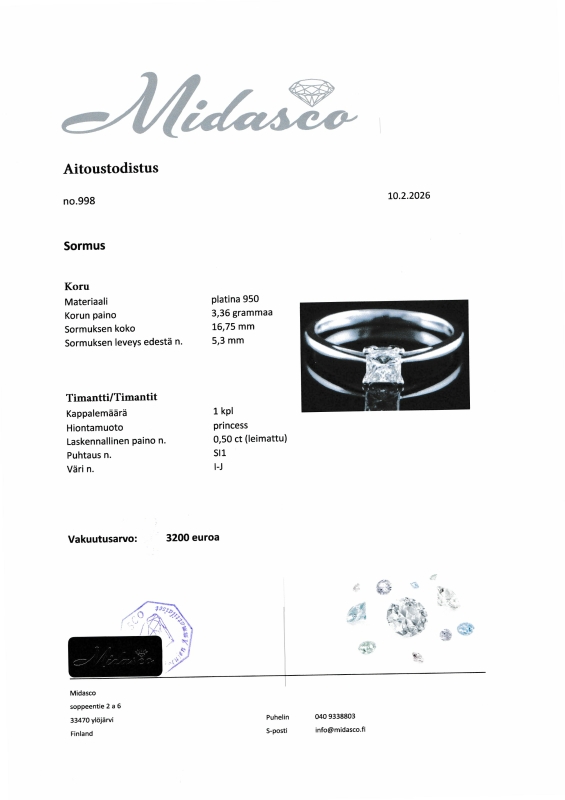 #1196 Platina 950 sormus timantilla (0,50ct), 3,36g