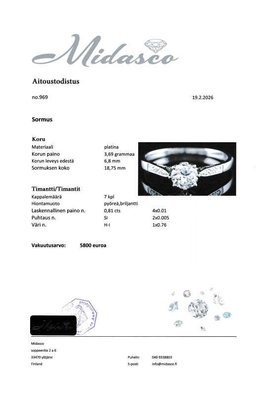 Mukana aitoustodistus sekä uusi korurasia. Koko hyvin muokattavissa ammattilaisen toimesta (ei sis. hintaan). Puhdistettu ja kiillotettu. Brutto 3,69g. Koko 18,75.
