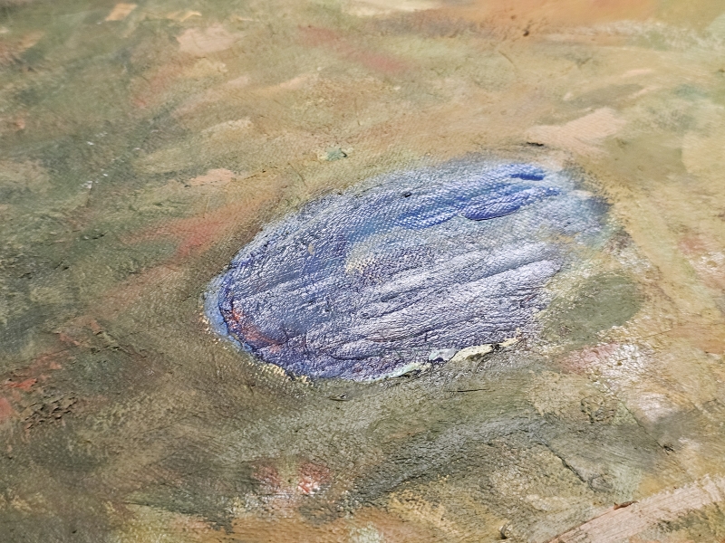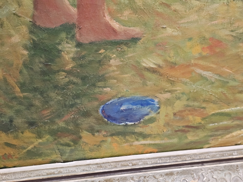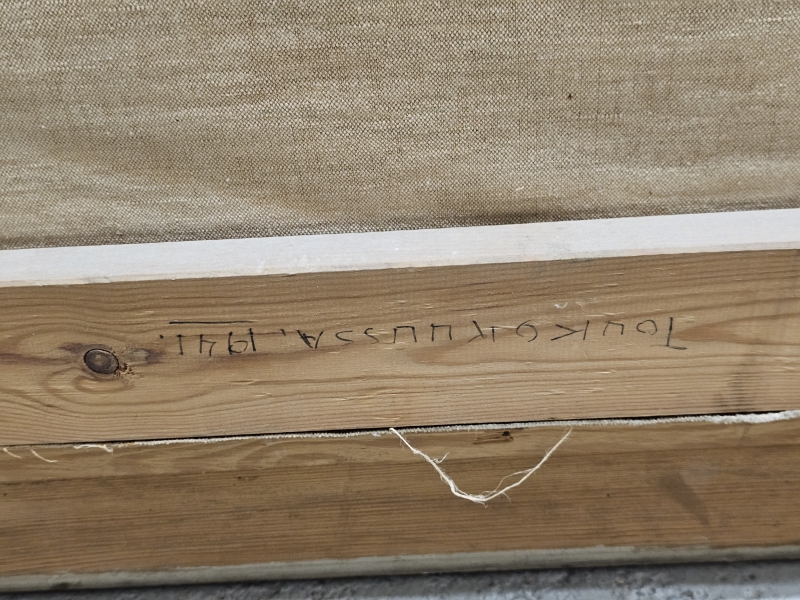 Maalissa joitakin halkeamia ja kulumaa. Kehyksineen 133,5cm x 164cm