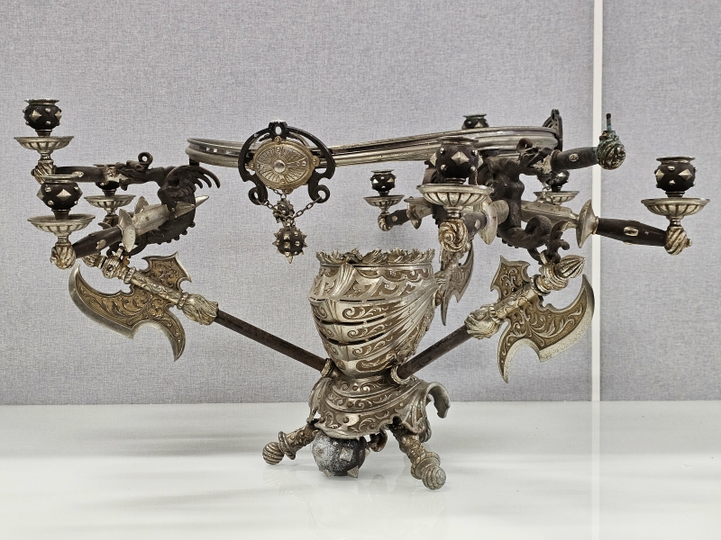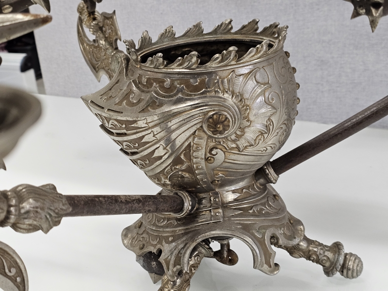 #1851 - Erikoinen metallinen ritariaiheinen pöytäteline kynttiläpaikoilla