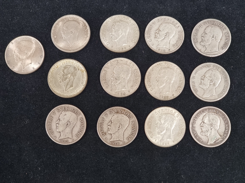 #1377 - Erä ruotsalaisia 2 kruunun hopeakolikoita: Mm. v. 1898, 1903, 1932. 800-835h