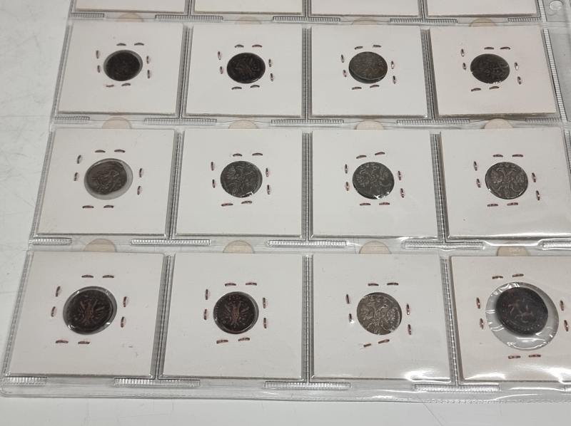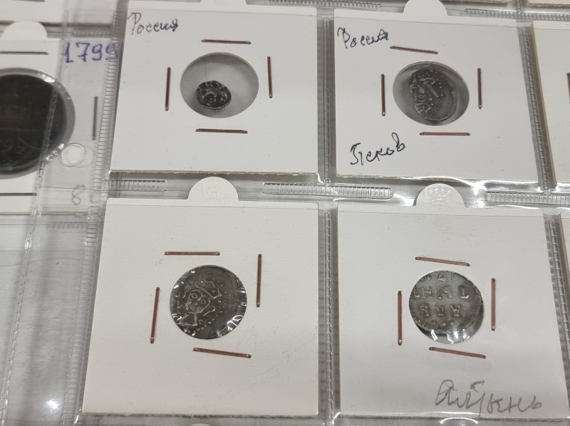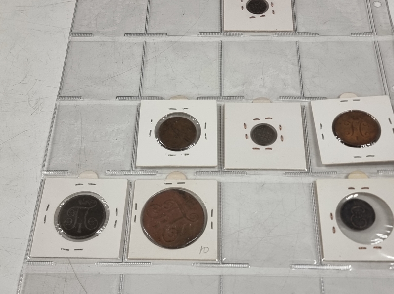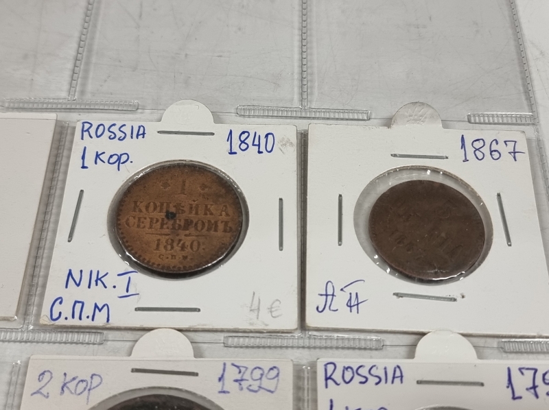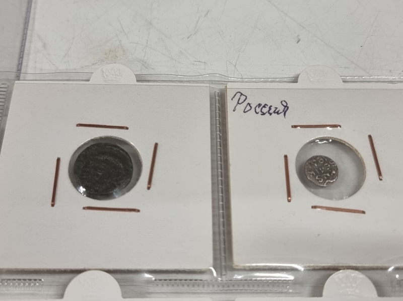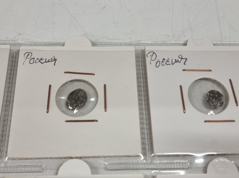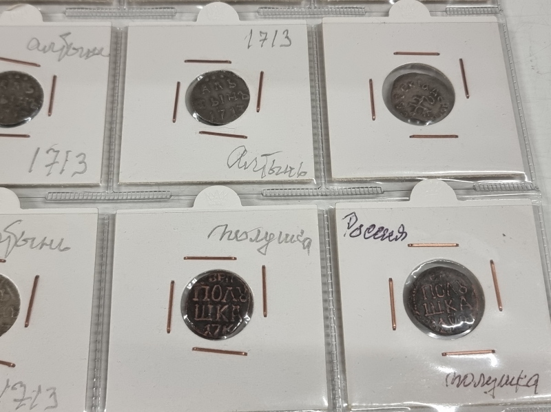 #1384 Hyvä erä vanhoja venäläisiä kolikoita. Osa hopeaa: 1 Altyn Peter I 1713 ym.