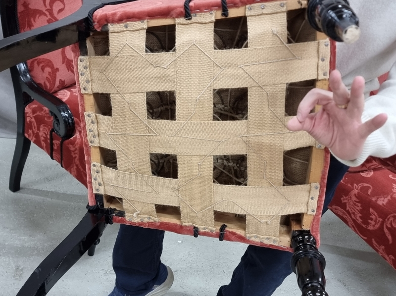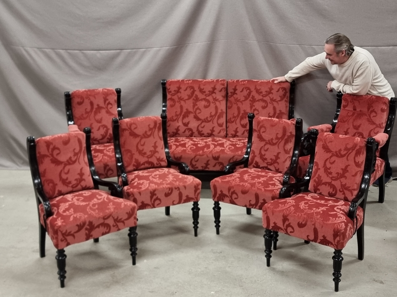#1857 1800-luvun lopun Suomen suuriruhtinaskunnan aikainen näyttävä sohvakalusto. Kalusto verhoiltu juuri uudelleen. 7-osainen