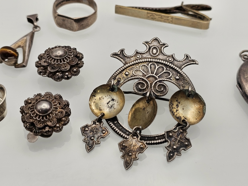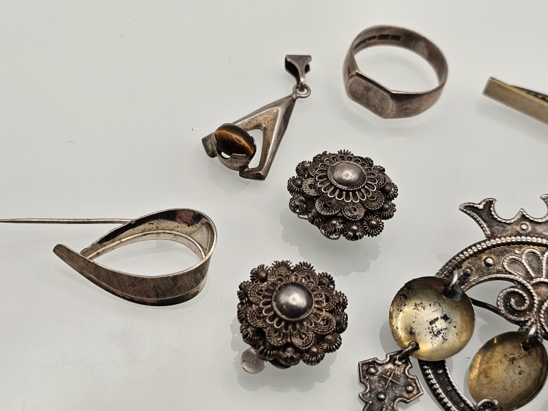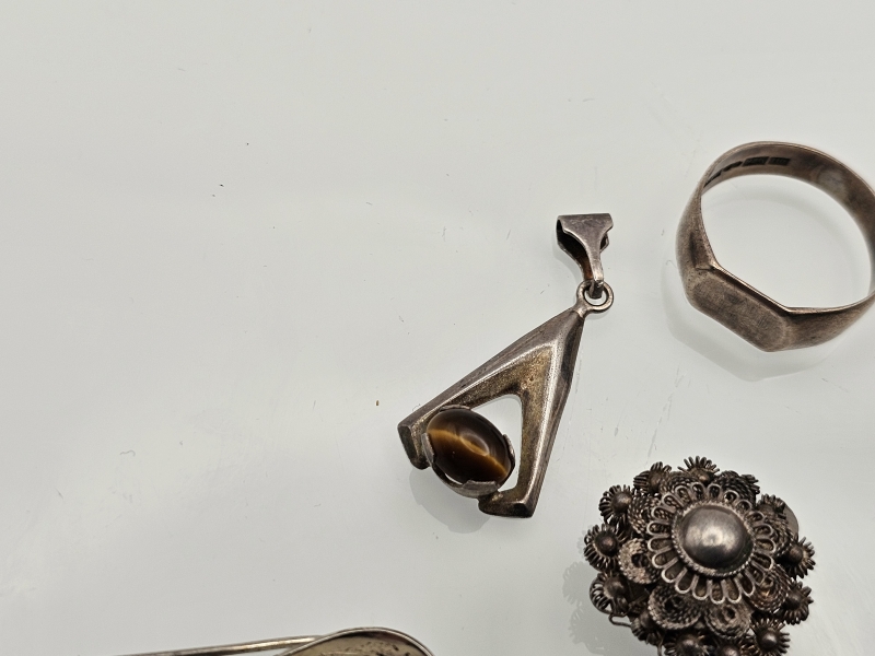 #1410 Erä hopeisia koruja: Mm. tiikerinsilmäriipus