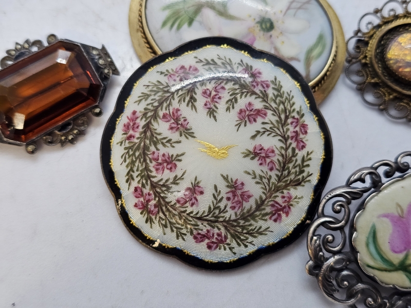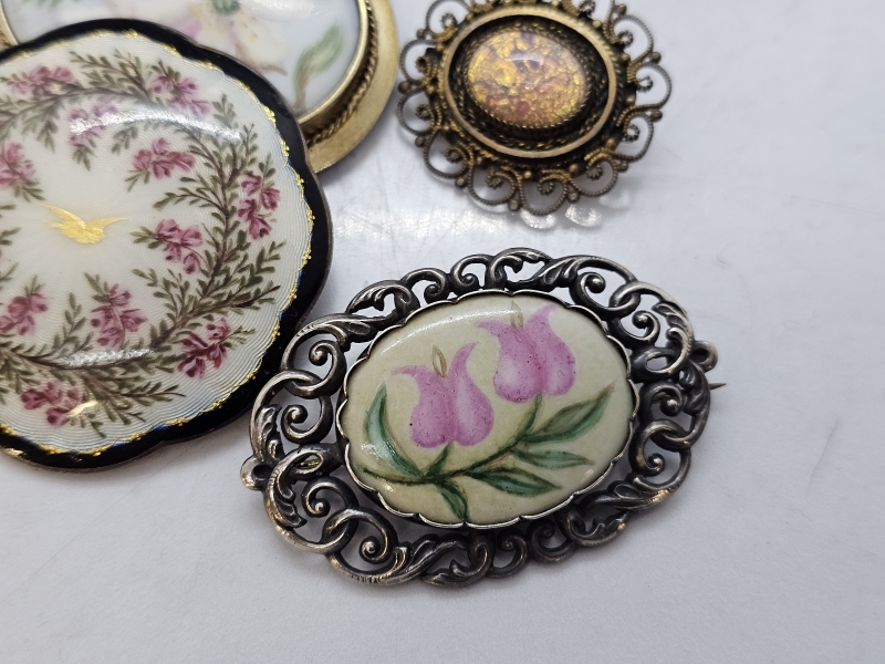 #1412 - Kauniita hopeisia rintakoruja: Mm. Emalikoristeella, signeerattu posliininen