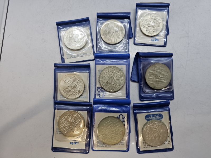 #1551 - 9kpl hopeisia juhlarahoja: Turku, Kalevala ja Suomi 60v, 500h, 212g