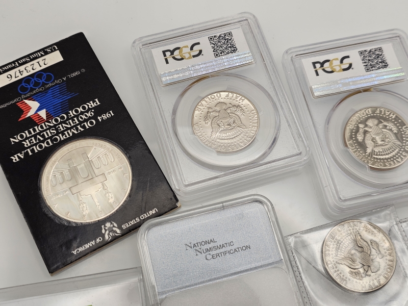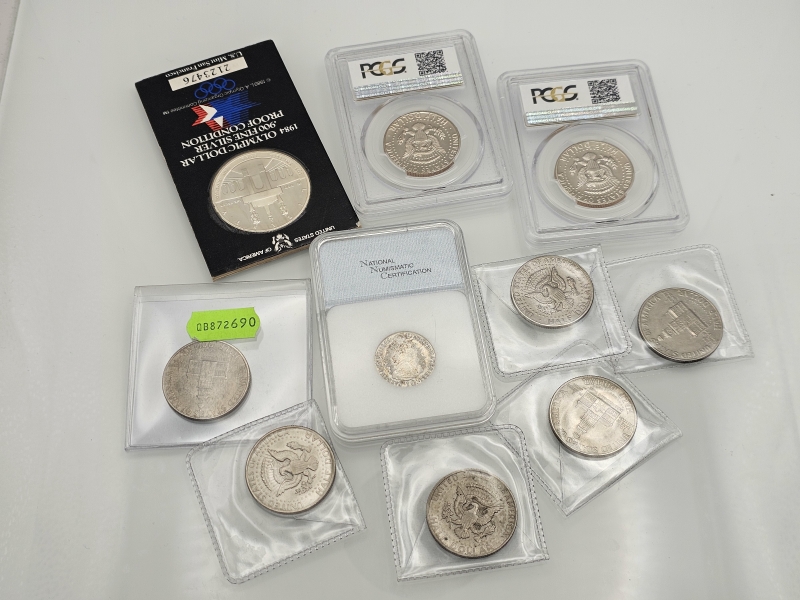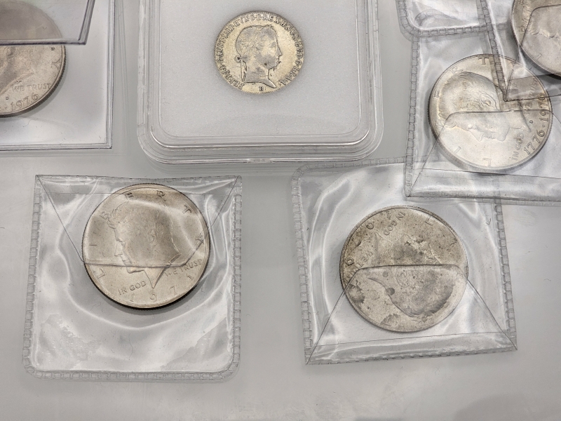 #1580 Hopeinen 10 Krajczar 1846 + hop. 1980 olympiaraha + Kennedy -kolikoita