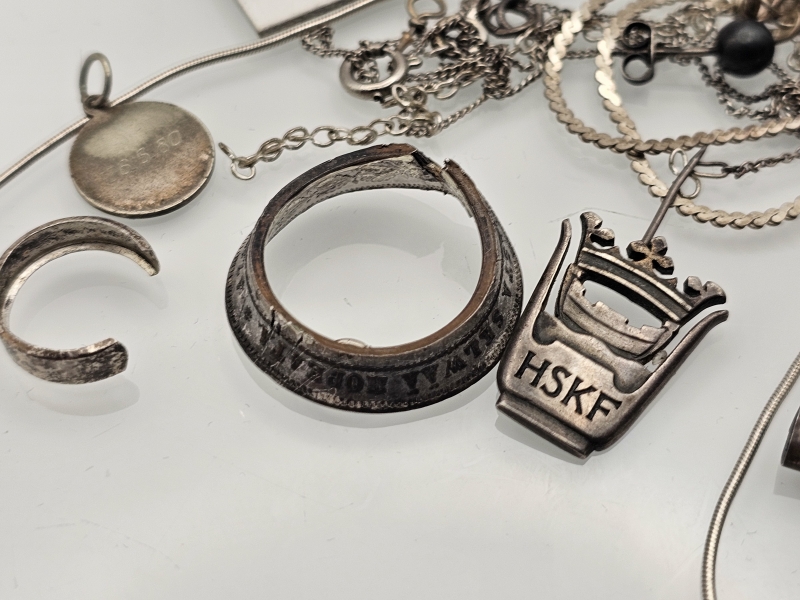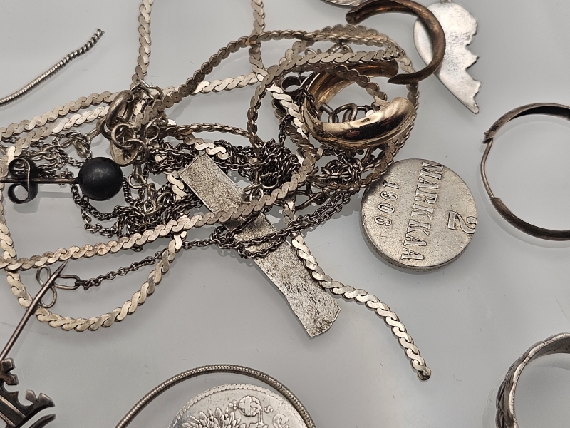 #1544 Erä hopeaa: Koruja joissa osassa vikaa, kolikoita ym., 67g