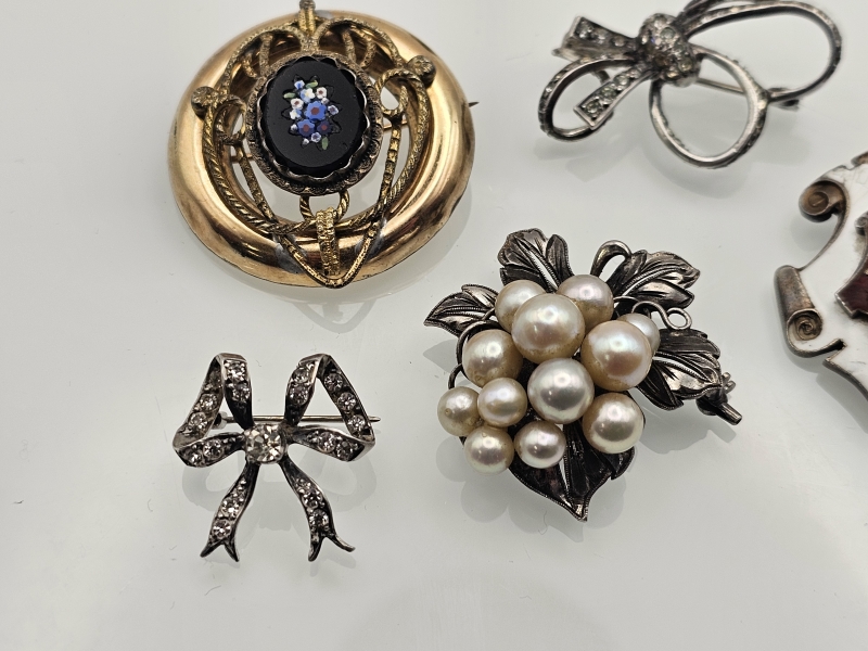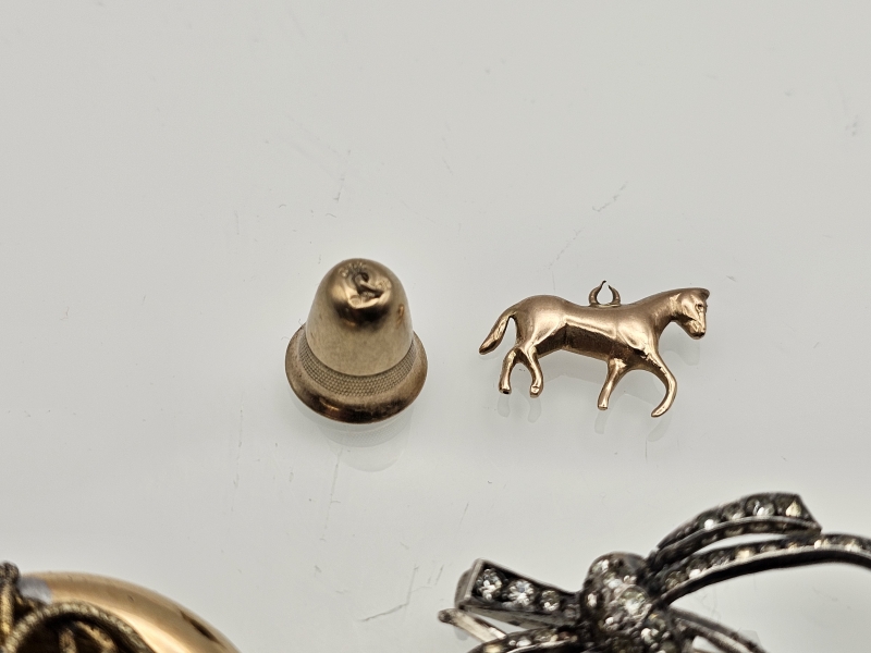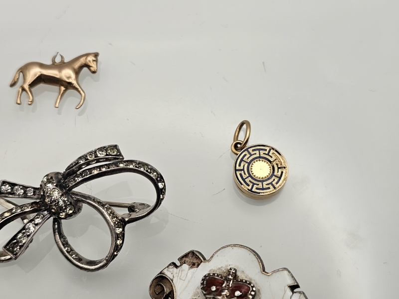 #1584 Erä koruja ja merkkejä joista osa hopeaa ja "kello" 9k kultaa [1,11g]