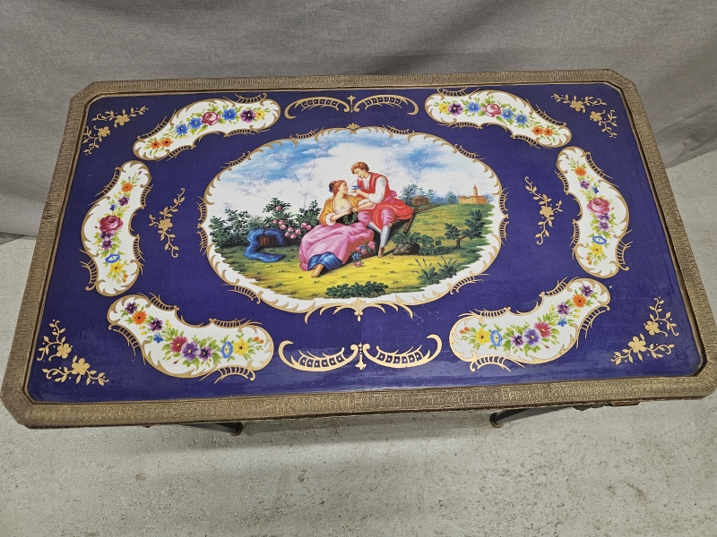 #1953 Kauniisti koristeltu Napoleon III -tyylinen pöytä posliinipinnalla ja -koristeilla sekä messinkilyötteillä