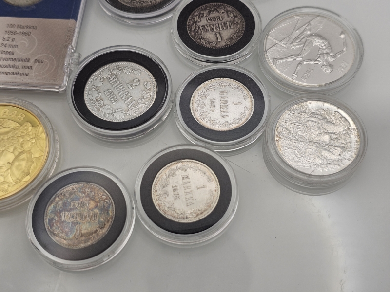 #1538 - Hopeisia juhlarahoja ja vanhoja hopeisia markka-kolikoita + ei-hopeinen juhlaraha