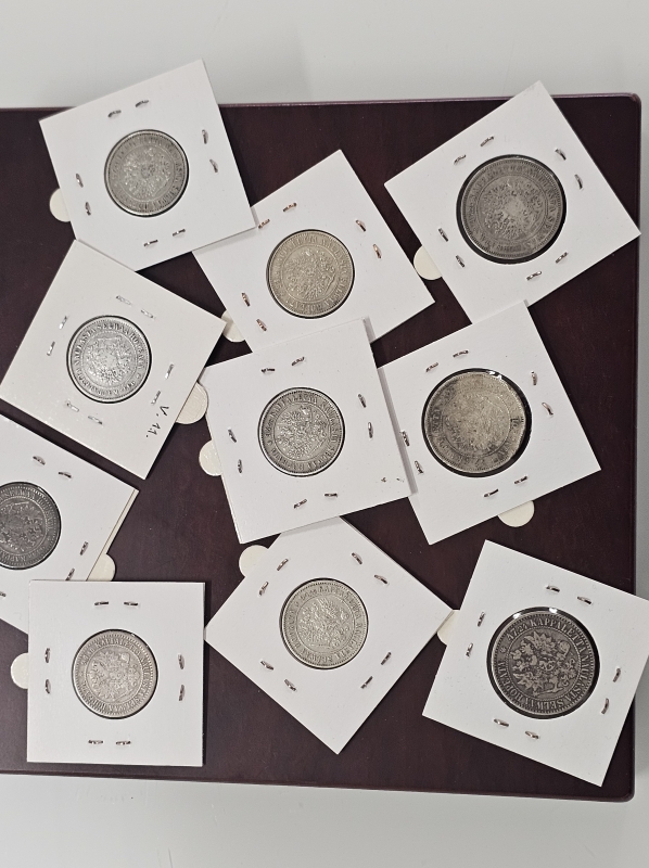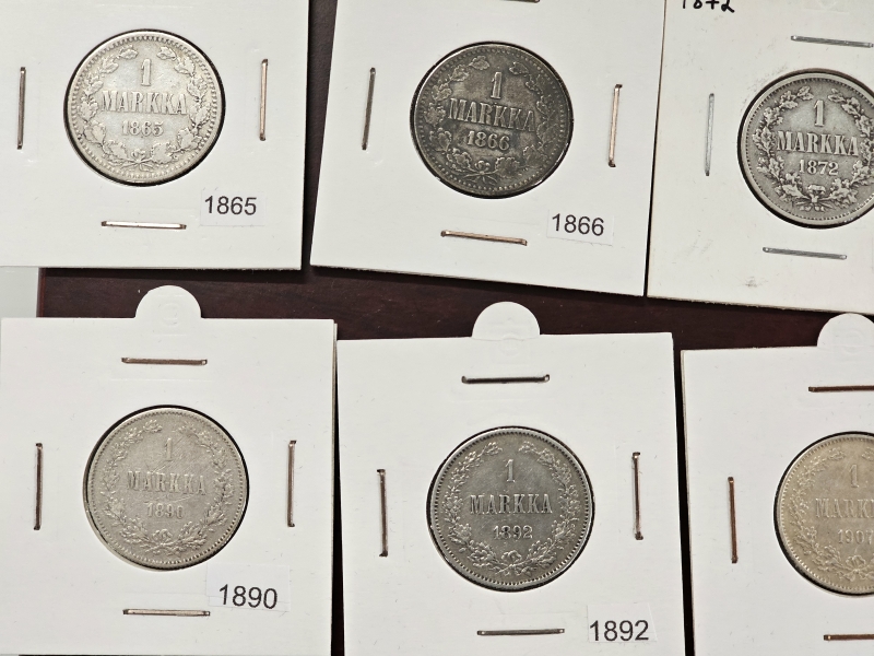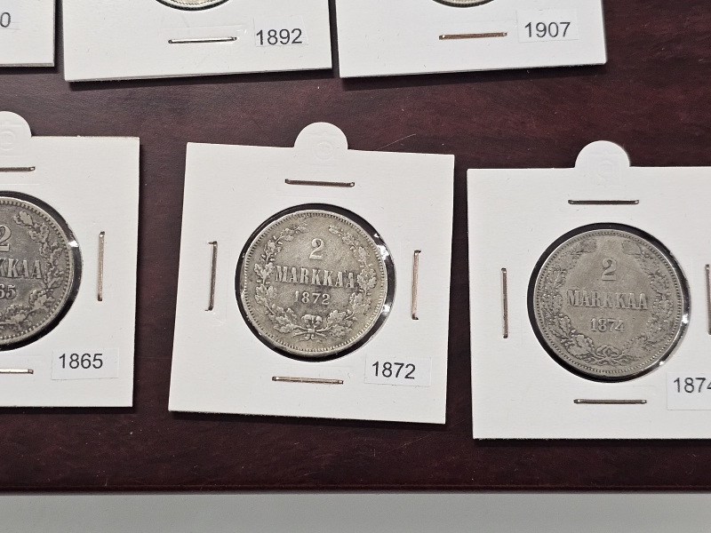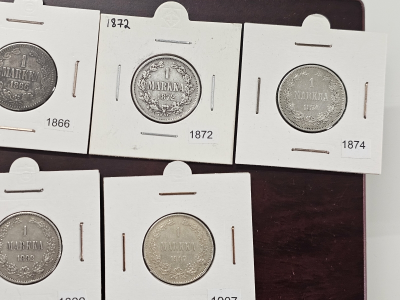 #1543 Hopeisia suomalaisia 1mk ja 2mk kolikoita, 868h, 67g