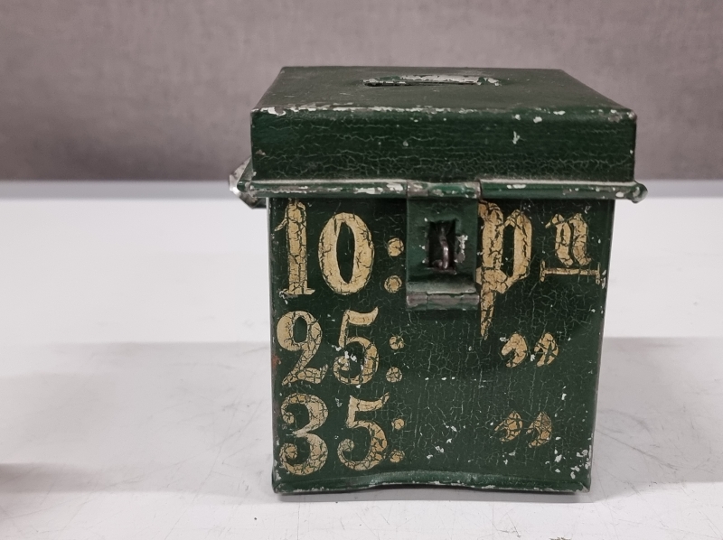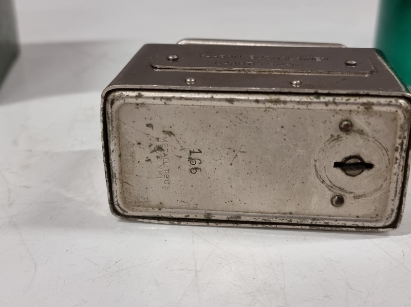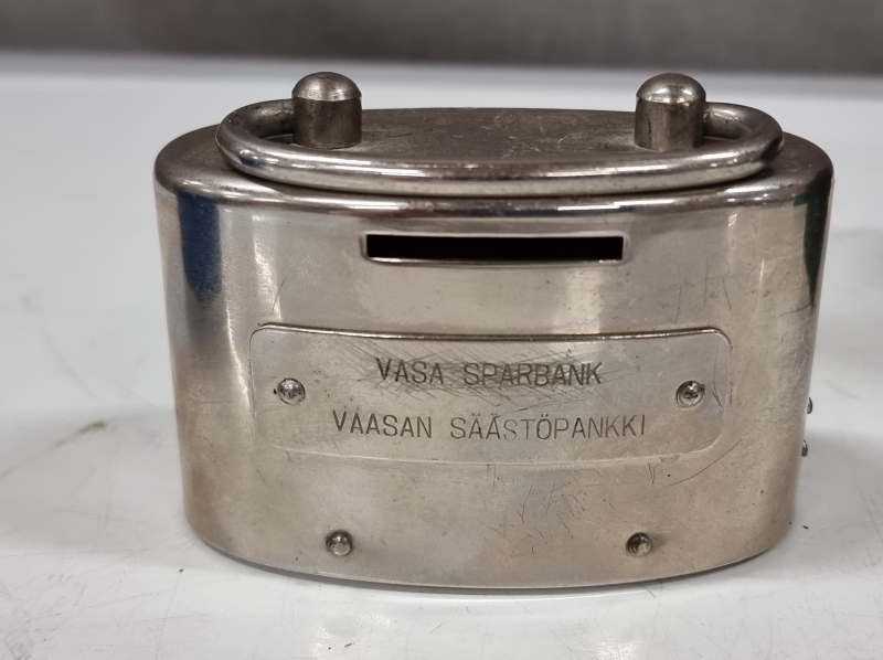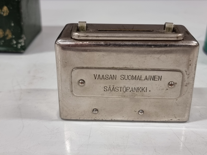 #2189 5kpl vanhoja metallisia säästölippaita: Vaasan suomalainen Säästöpankki, kolehtipankki ym.
