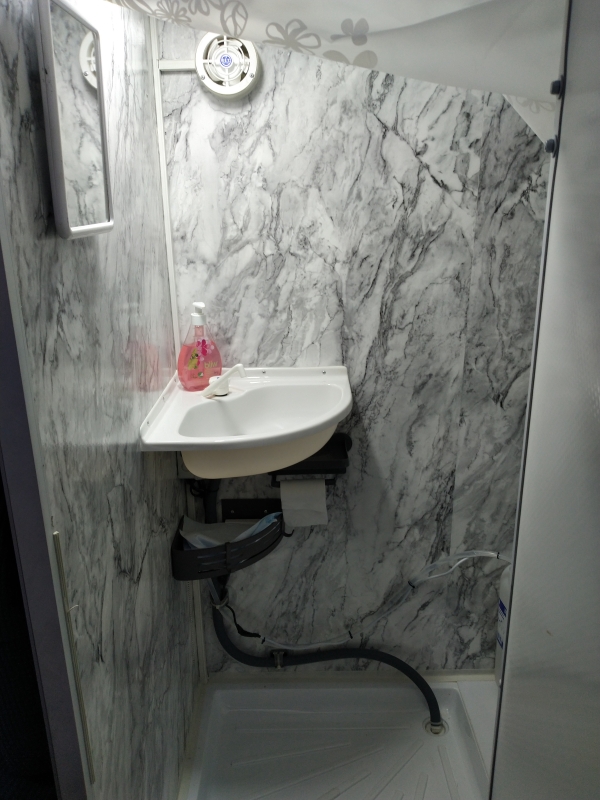 On wc (kasetti), suihku, liesi, jääkaappi pakastinlokerolla, mikroaaltouuni, manuaalinen ilmastointi, erillisvuoteet (vuodepaikkoja 2), lattiamatot, kasettiverhot, tukijalat yms.