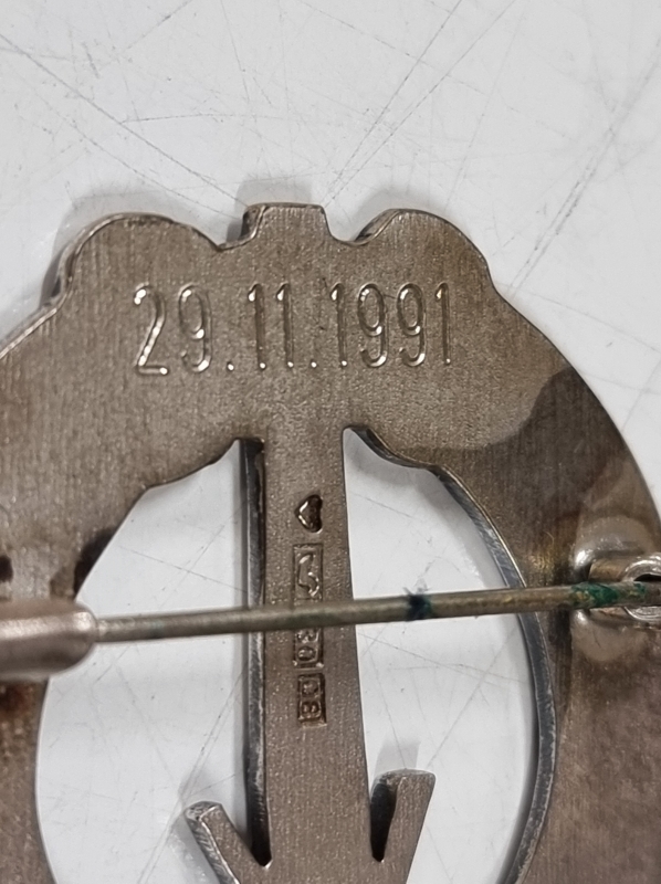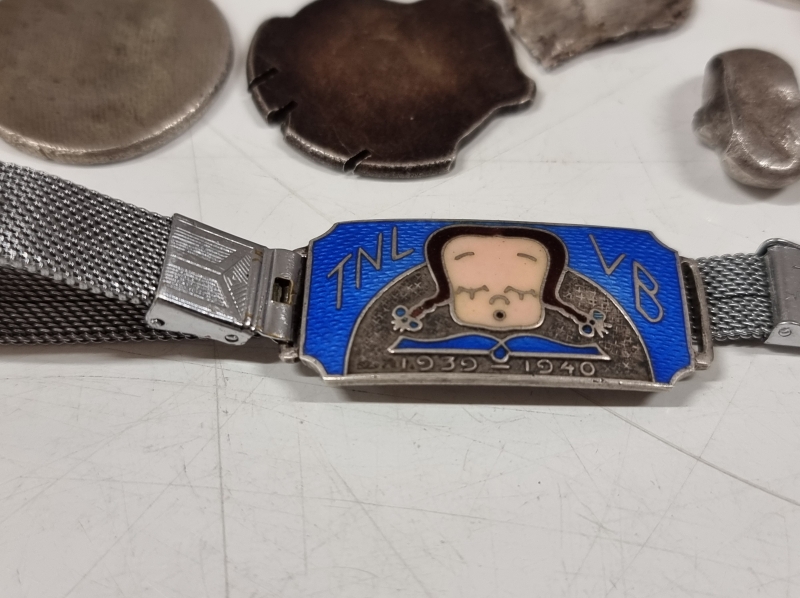 #1585 Hopeisia rintamerkkejä, rannekoru ym. Kaikki merkit eivät ole hopeaa.