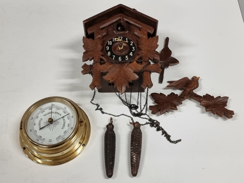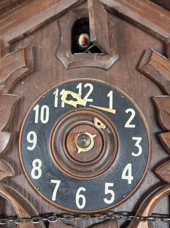 Kellon viisarit poikki, mutta käki kukkuu. Puntarin H: 18,5cm