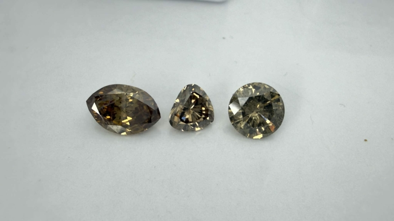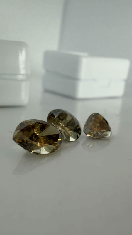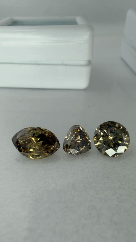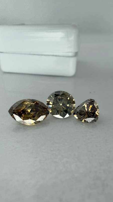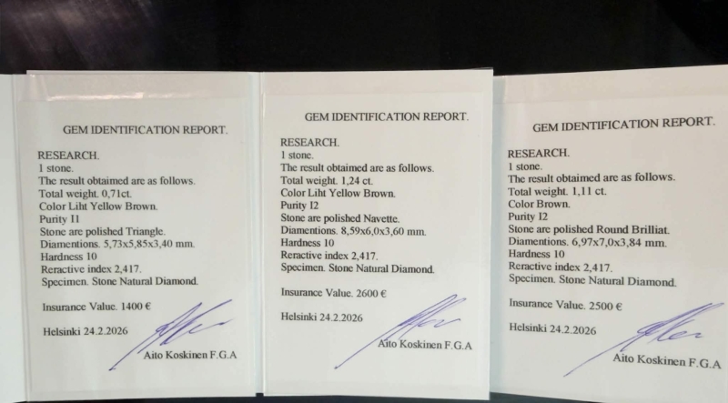 #1628 3kpl timantteja: 1,24ct light yellow brown Navette / 1,11ct Brown Round Brilliant / 0,71ct light yellow brown Triangle + todistukset