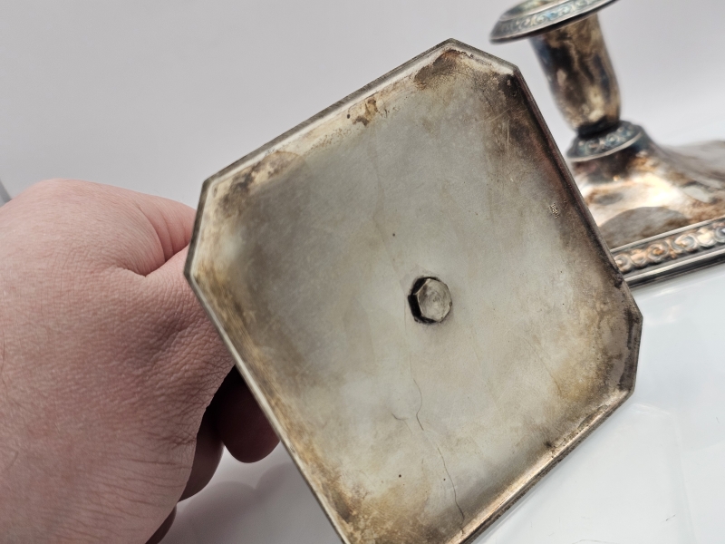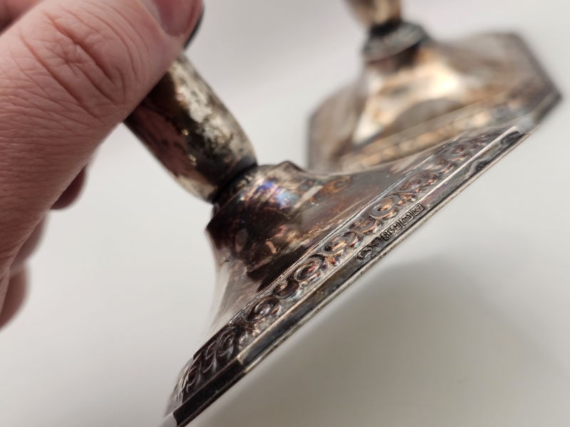 #939 - 2kpl hopeisia kynttilänjalkoja, 813h, br. 193g