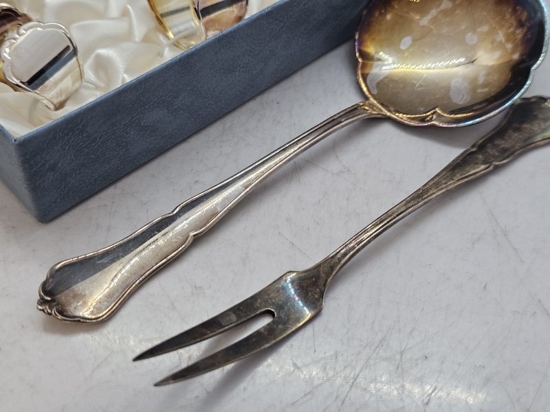 #945 - Hopeisia chippendale servettirenkaita, haarukka ja lusikka, 830h, 84g