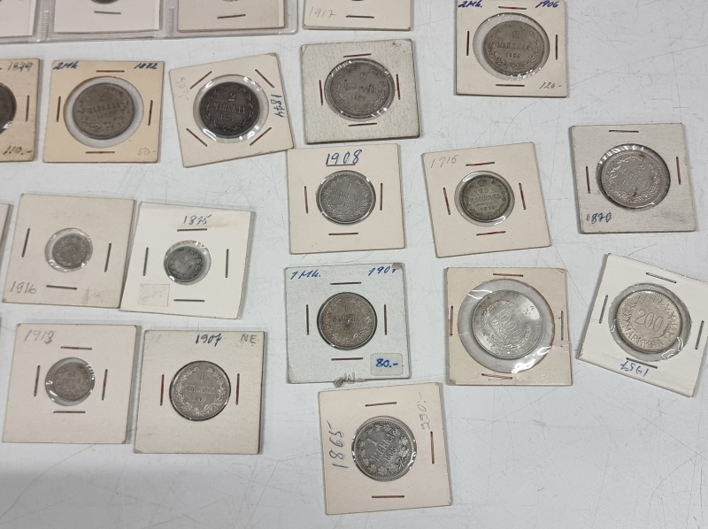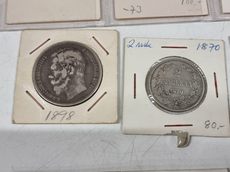 #980 - Hyvä erä hopeakolikoita: 1 rupla 1898, 2 mk 1870, 1 mk 1865 ym. 500-900h