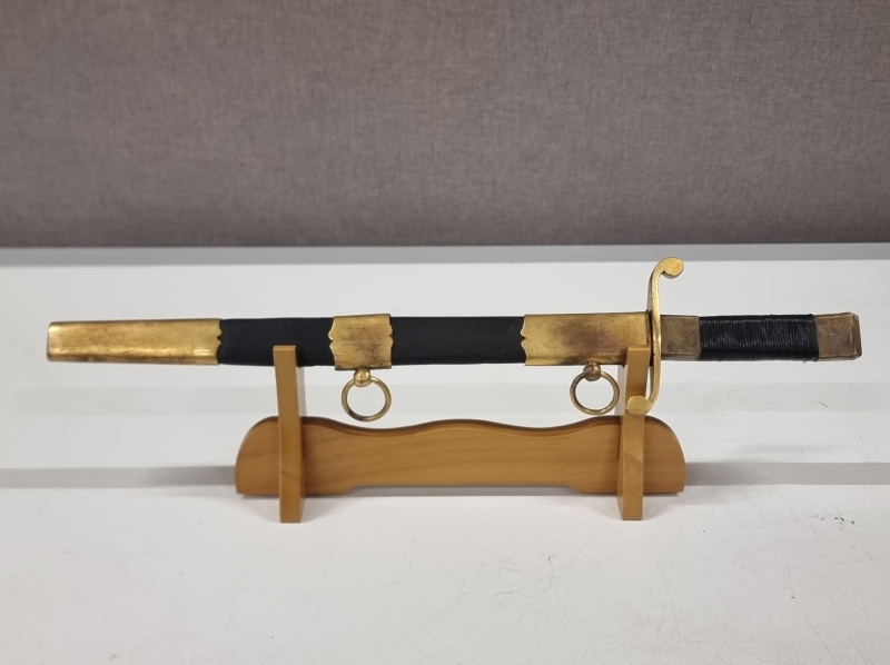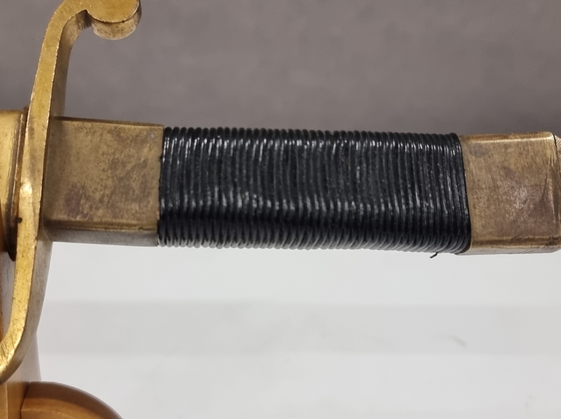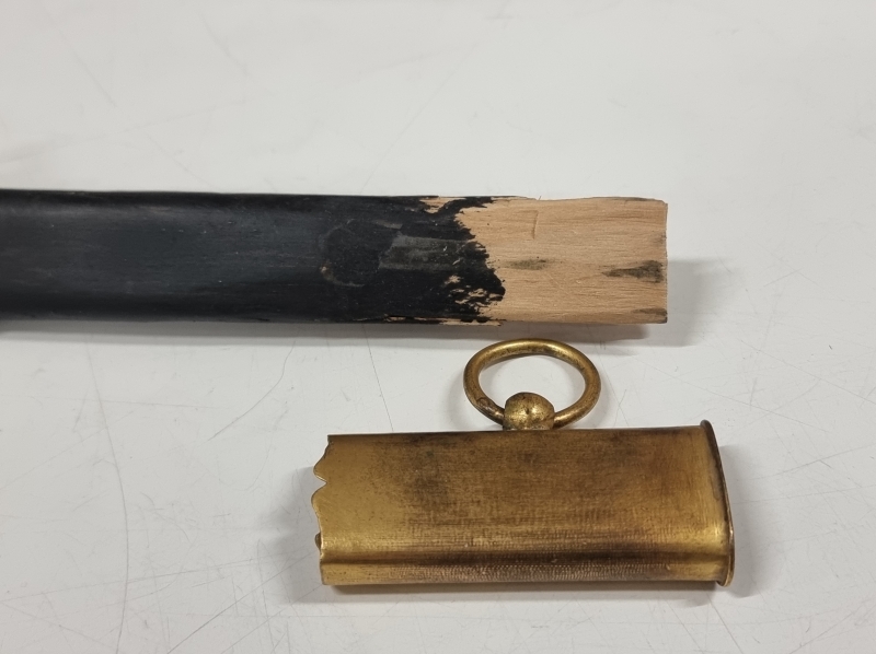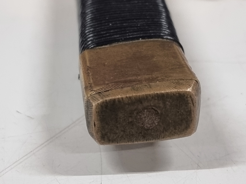 Kahvassa korjauksia: Punokset eivät alkuperäiset, kahvan nuppi puuttuu. Tupen nahkaosa korvattu puulla. Pituus 36cm