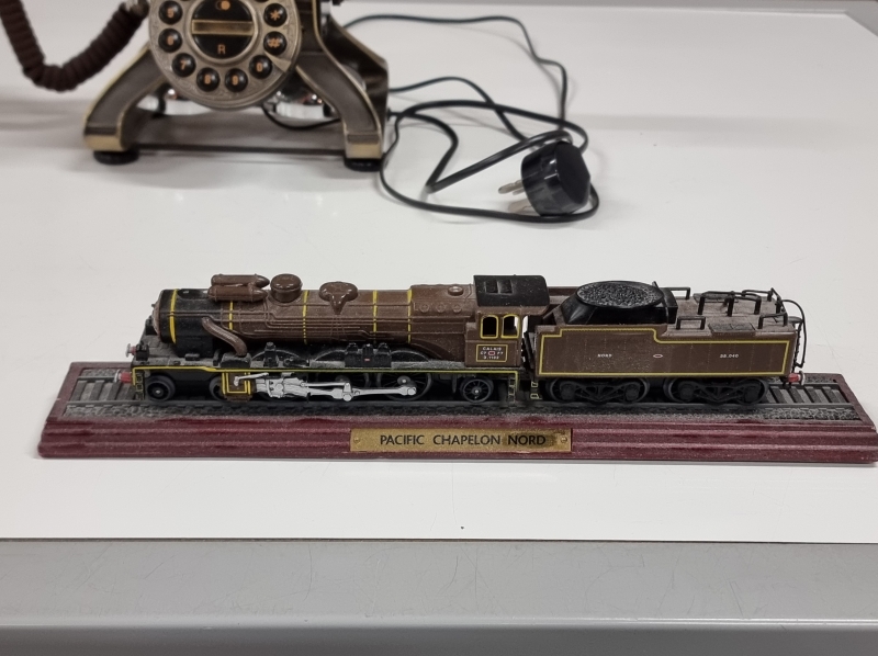#2371 Vanhan junaradan osia + 3kpl koristevetureita ja vanhan näköinen pöytäpuhelin