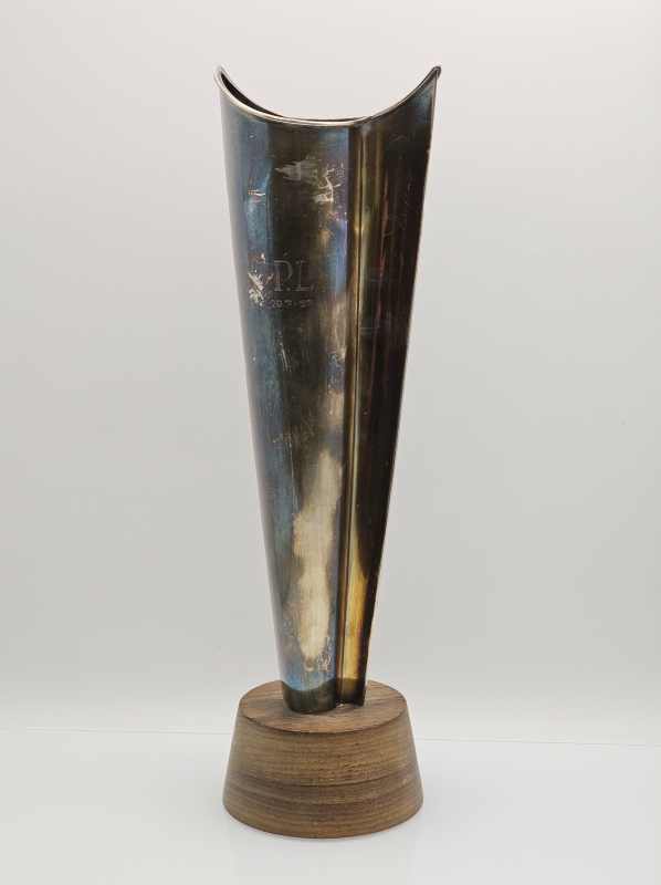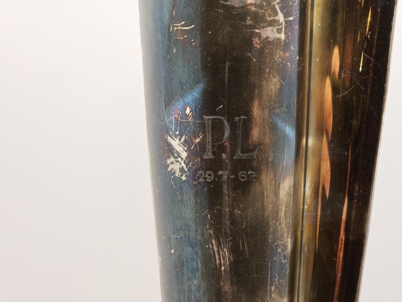 #855 Hopeinen Tapio Wirkkala Liekki -maljakko puujalustalla v.1966, 916h, br. 319g