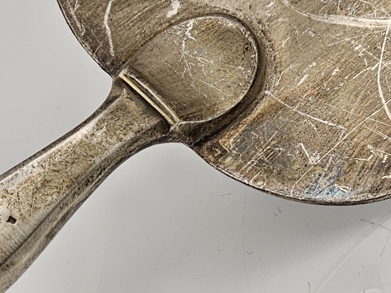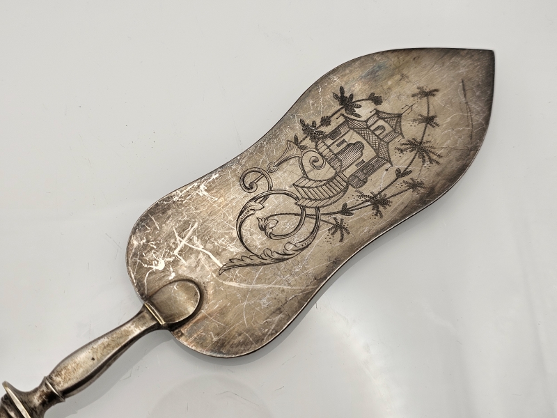 #886 Vanha hopeavartinen ranskalainen otinlapio hienoilla kaiverruksilla, br. 163g