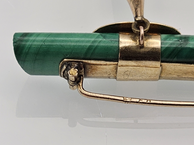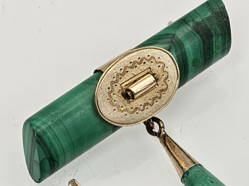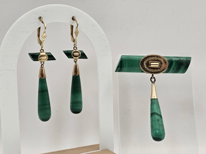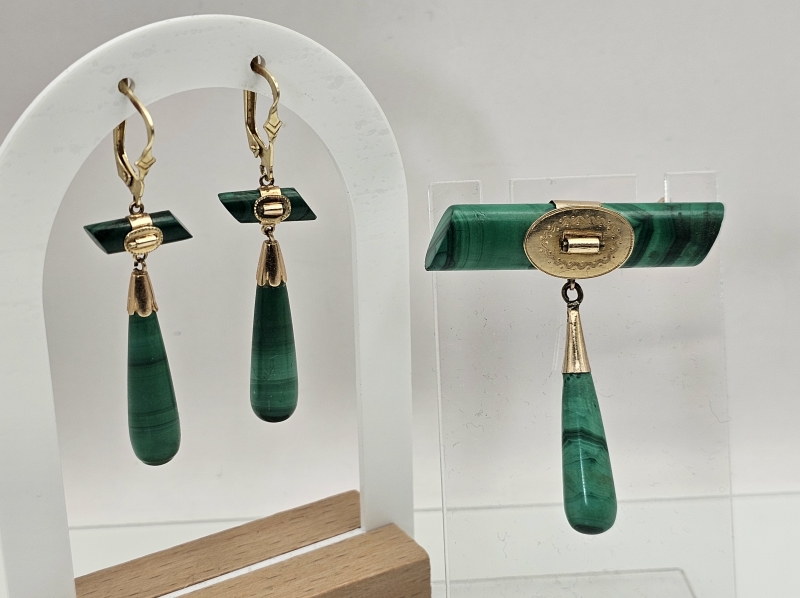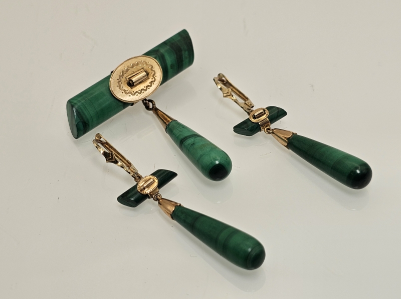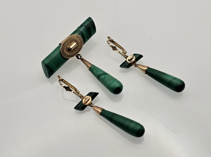 #846 14k kultainen venäläinen rintakoru ja korvakorut malakiitilla, 23,6g