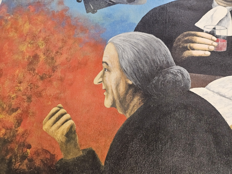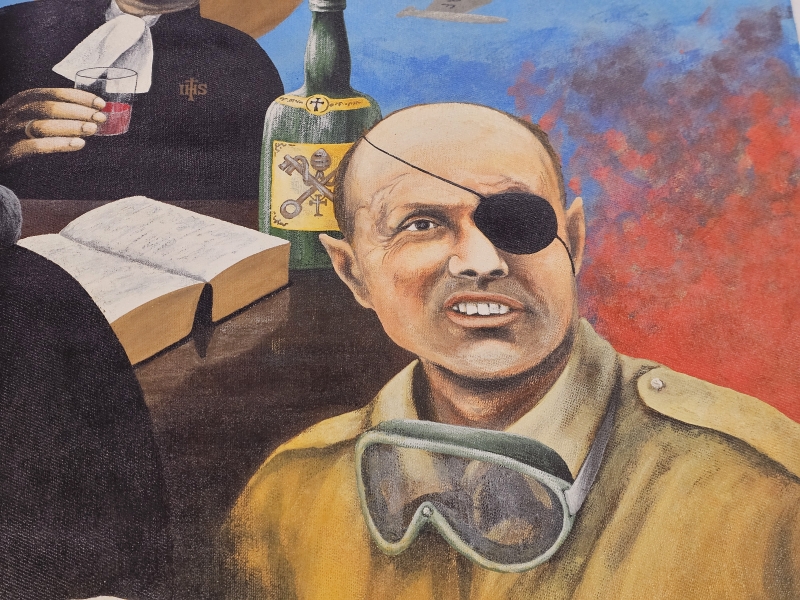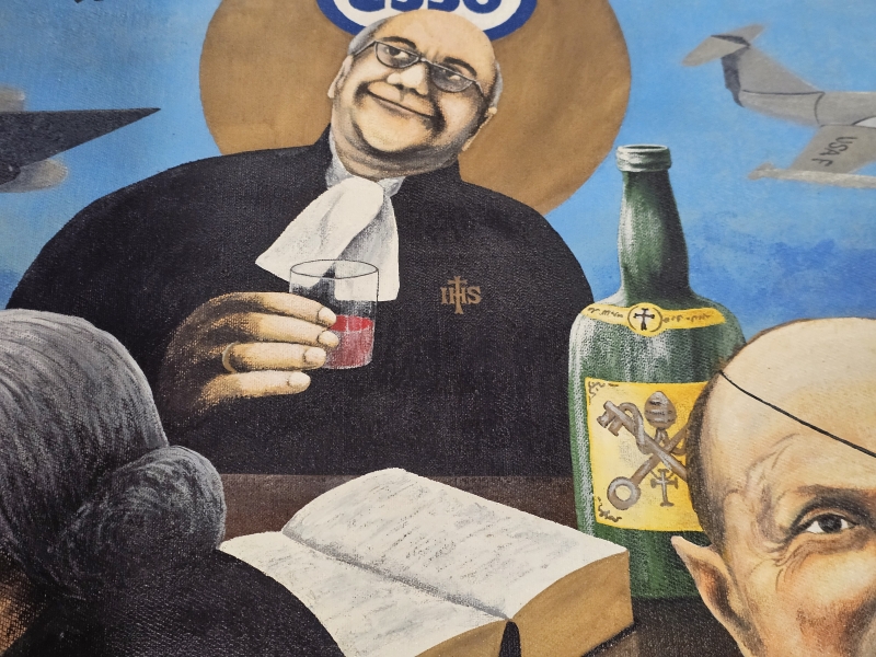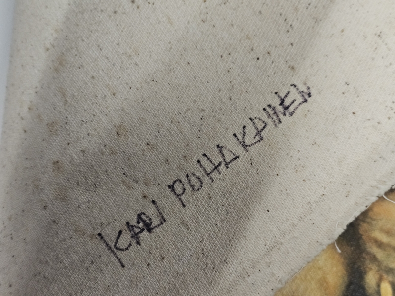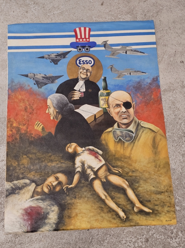 #1837 Kehystämätön iso öljyvärimaalaus, Ka-Pu eli Kari Puhakainen 1972, sodanvastainen aihe