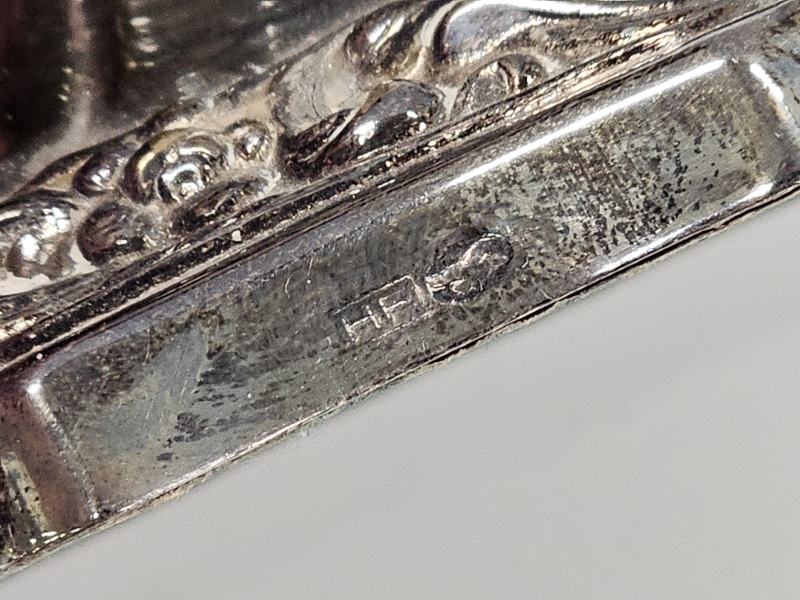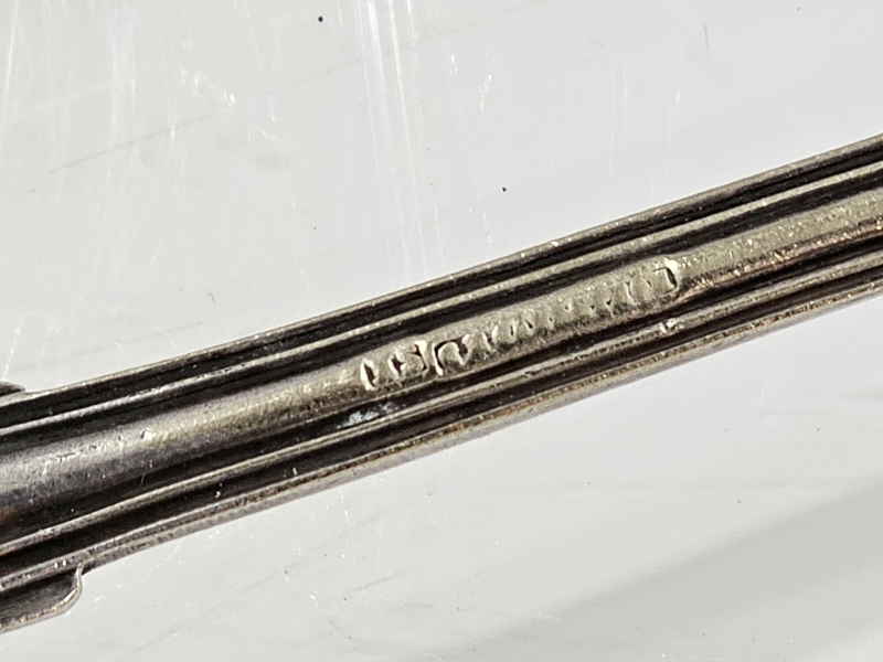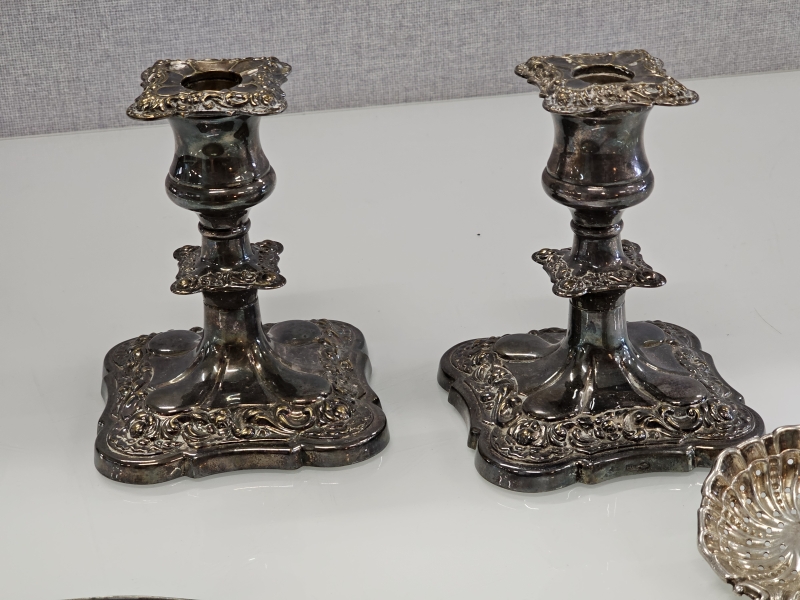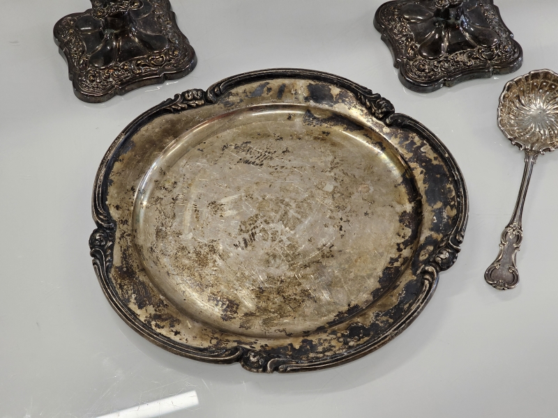 #2300 Hopeoituja esineitä: 2kpl kynttilänjalkoja 1800-l. + lautanen + sirotinlusikka