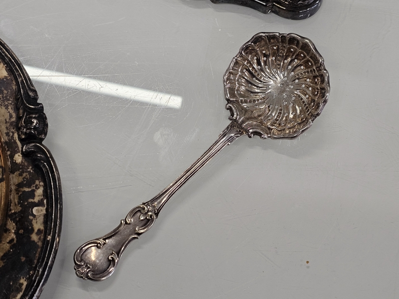 #2300 - Hopeoituja esineitä: 2kpl kynttilänjalkoja 1800-l. + lautanen + sirotinlusikka